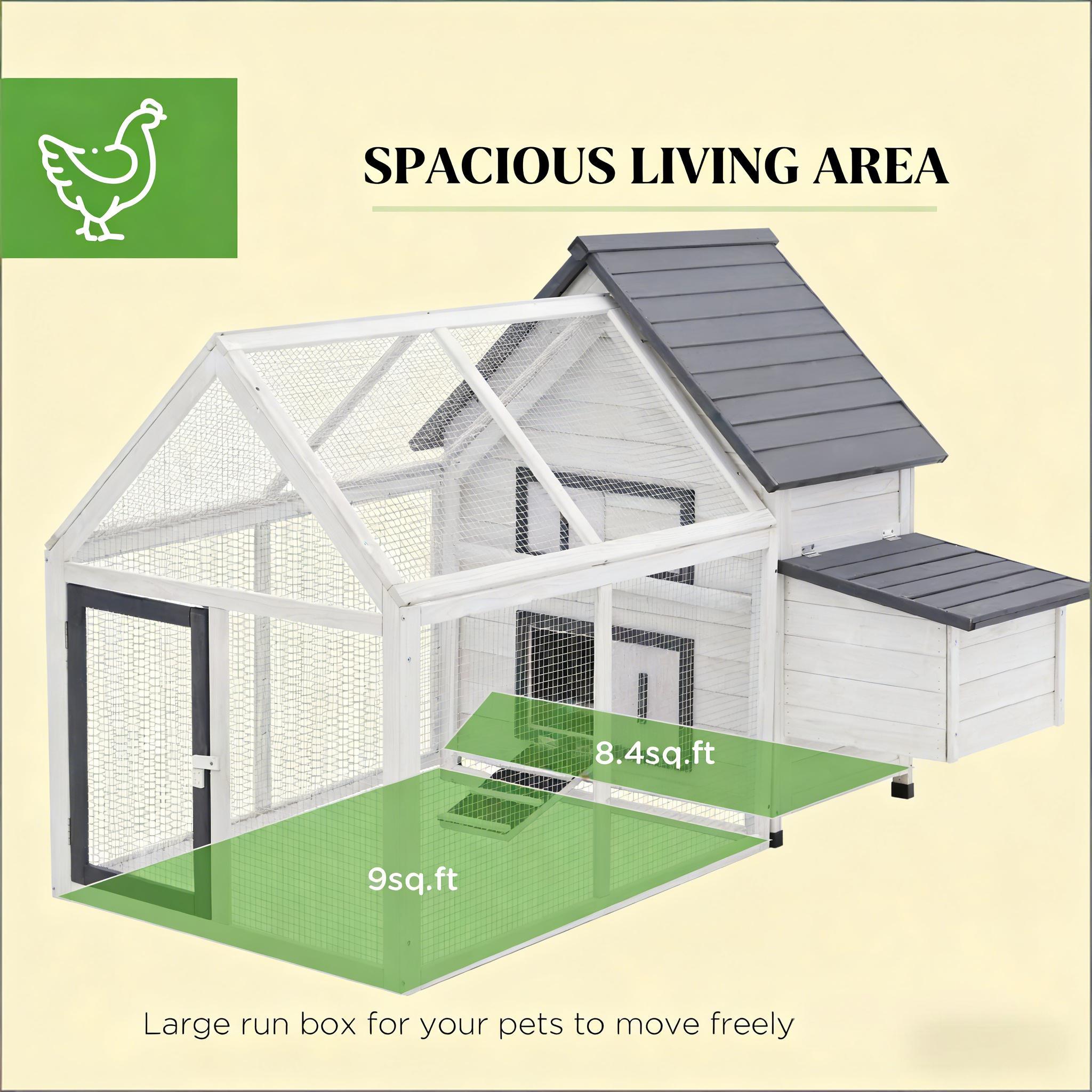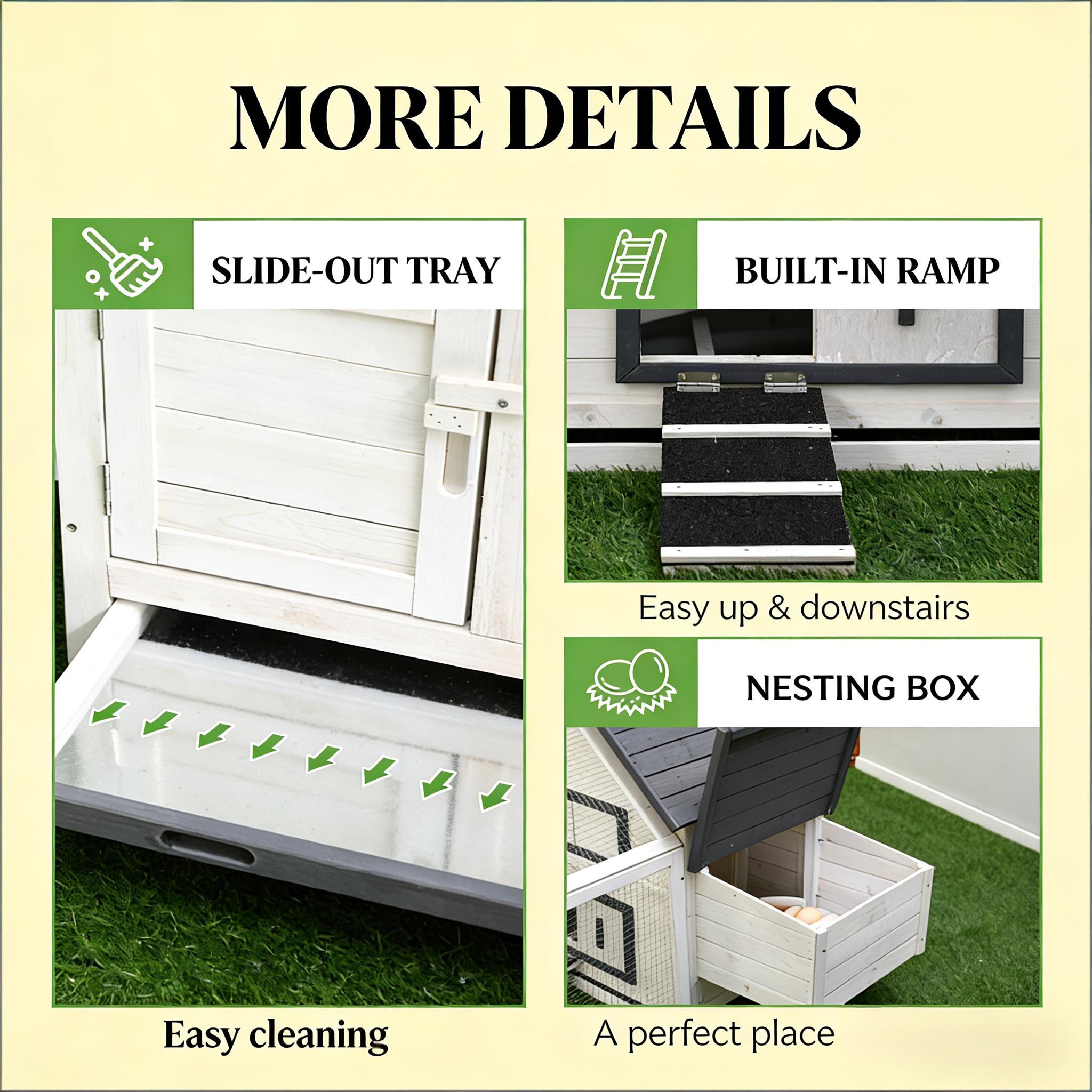 Features: - Durable fir wood construction with elevated living house, backyard run, nesting box, ramp and door - Anti UV and weather resistant roof protects your pets from outdoor weather conditions - Ramp allows chickens to easily enter and exit the housing area - Removable bottom sliding tray for easy cleaning - Living house and run box with doors allow you to easily take out and place your animals - Durable spray wire keeps your pets from predator and ensures excellent air circulation - Includes observation windows that provide odor free air flow into the living area - It is recommended to fill the tray with straw when in use - Assembly is required with all necessary hardware included Specification: - Color: Grey and White - Material: Fir Wood - Overall Dimensions: 65.25" L x 47.25" W x 44" H - Living House Dimensions: 48.75" L x 24.75" W x 44"H - Nesting Box Dimensions: 20" L x 15" W x 13"H - Run Box Dimensions: 42.25" L x 31" W x 39.5"H - Run Box Door Size: 12.5" W x 20" H - Ramp Size: 11.75" L x 6.25" W - Slide-Out Tray Size: 27.75" L x 19.25" W