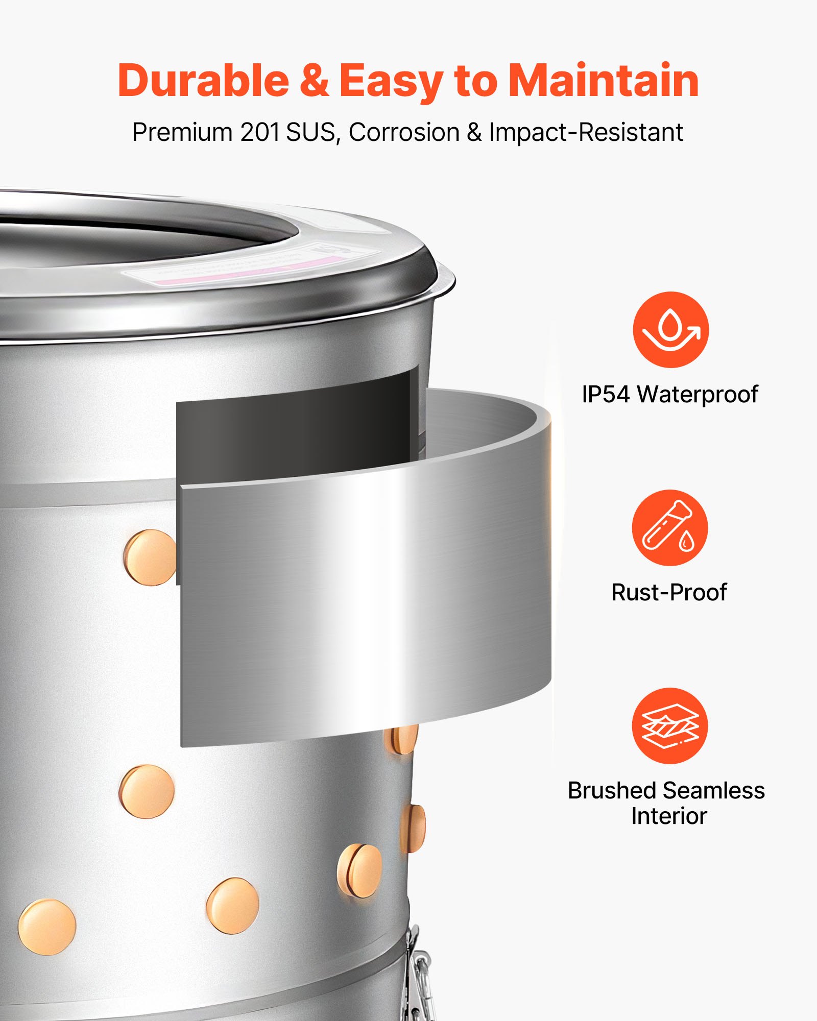 Premium Construction: Built with an IP54-rated weatherproof electrical enclosure for security. Food-grade 430 stainless steel and corrosion-resistant outdoor design ensure durability. Our electric poultry plucker with reinforced legs and wheels provide long-term stability