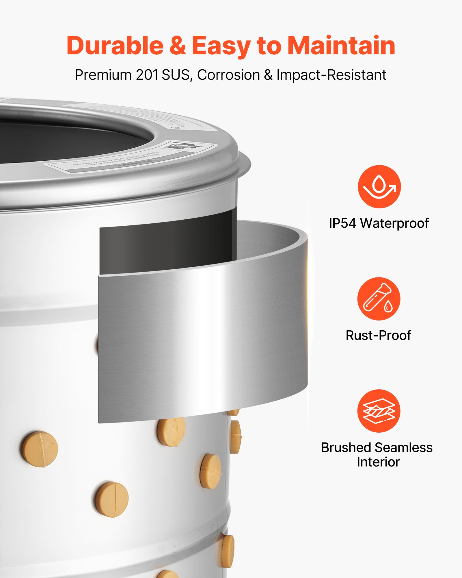Premium Construction: Built with an IP54-rated weatherproof electrical enclosure for security. Food-grade 430 stainless steel and corrosion-resistant outdoor design ensure durability. Our electric poultry plucker with reinforced legs and wheels provide long-term stability