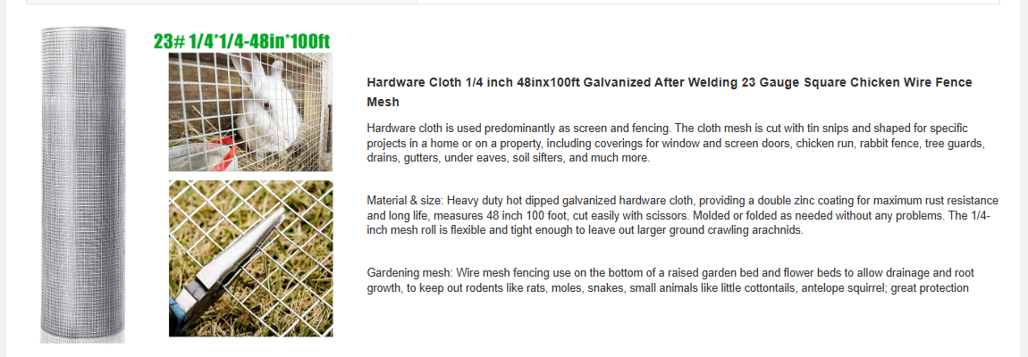 Product Name:Hardware Cloth 1/4 inch 48in x 100ft 23 Gauge, Hot-dip Galvanized After Welding Chicken Wire Fence Roll Garden Plant Welded Metal Wire Fencing Roll, Rabbit Cages Snake Fence