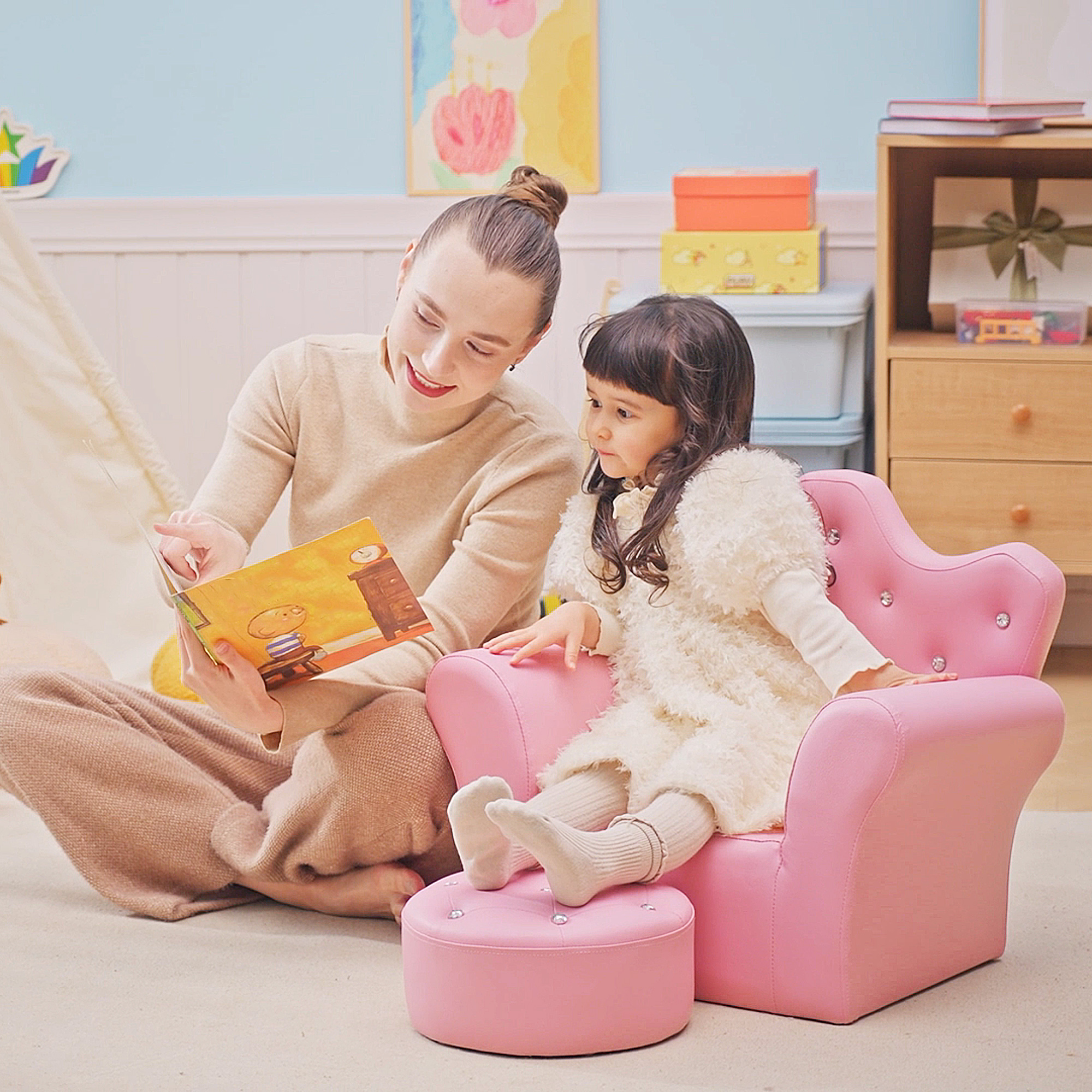 Why must adults always enjoy all the fun? The children's sofa set allows your children to enjoy the same relaxation, but the size is small and suitable for children! It features an armchair of two-side armrest and a footstool, providing your children with ultimate comfort and security. The solid wood structure and soft padding can support a weight of 50 kg. Recommended for children from 3 to 7 years old. An ideal gift for your little ones in their childhood and will be a perfect decoration in the nursery or playroom.