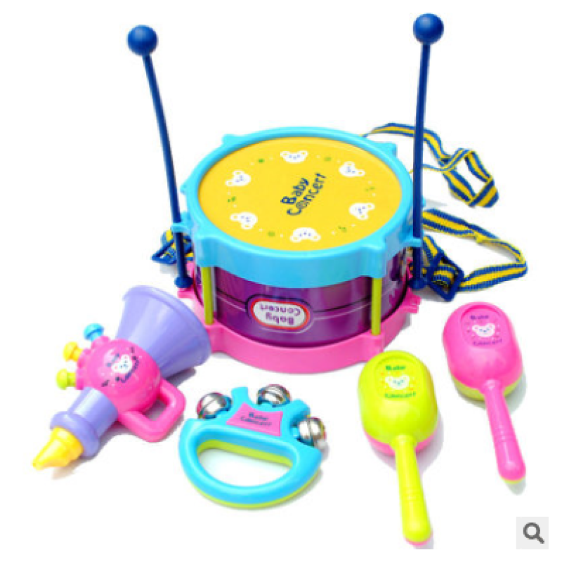 Condition: 100% brand new and high quality Quantity: 1 Set (5pc) Color: as picture show Material: Plastic Approx Size: Drum: 8cm/3.15''x 12cm/4.72''(HxD) Trumpet: 11cm/4.33''(L) Cabasa: 11.5cm/4.52''(L) Handbell: 7cm/2.75''x7cm2.75''(LxH) Suitable for Age : suit 3+ years old
