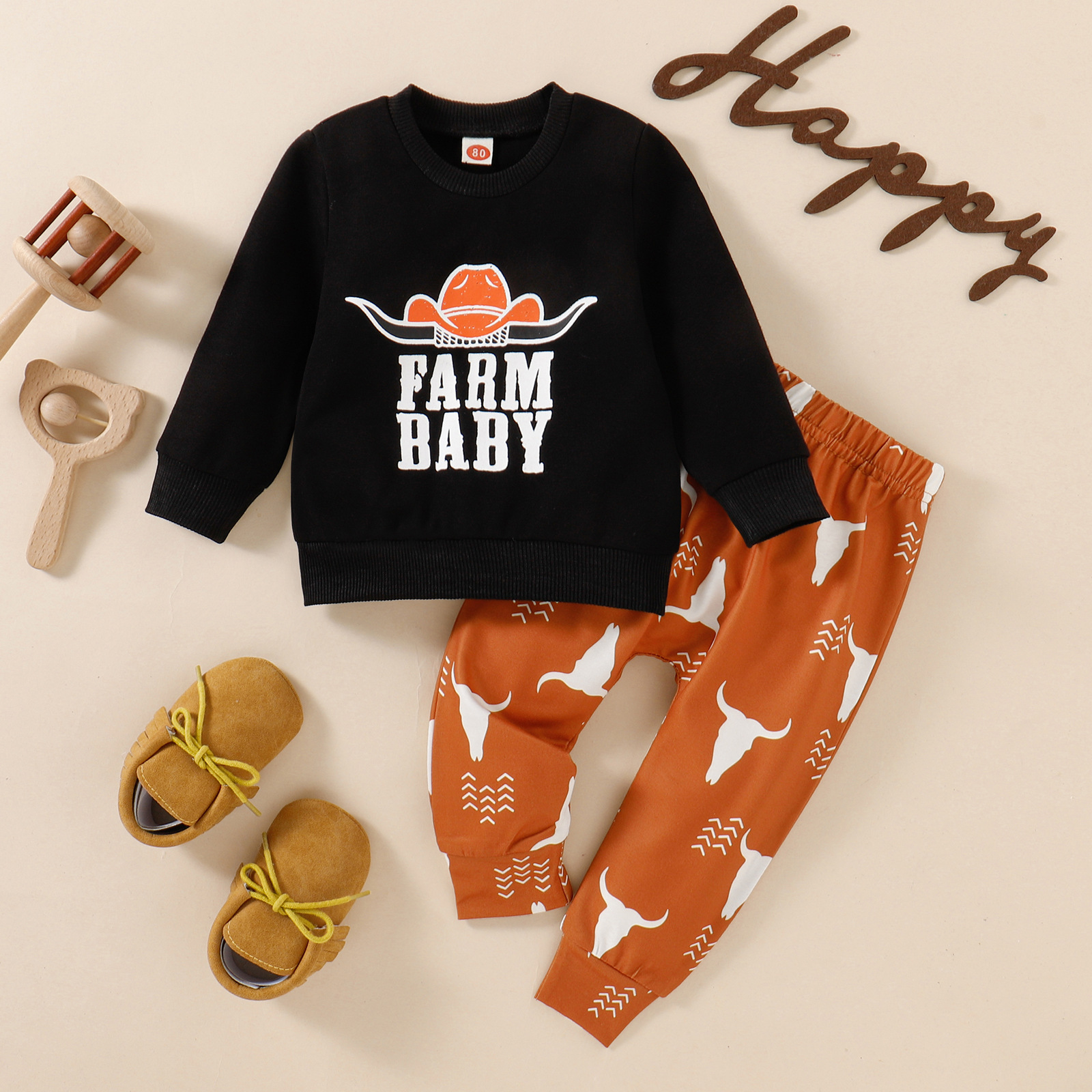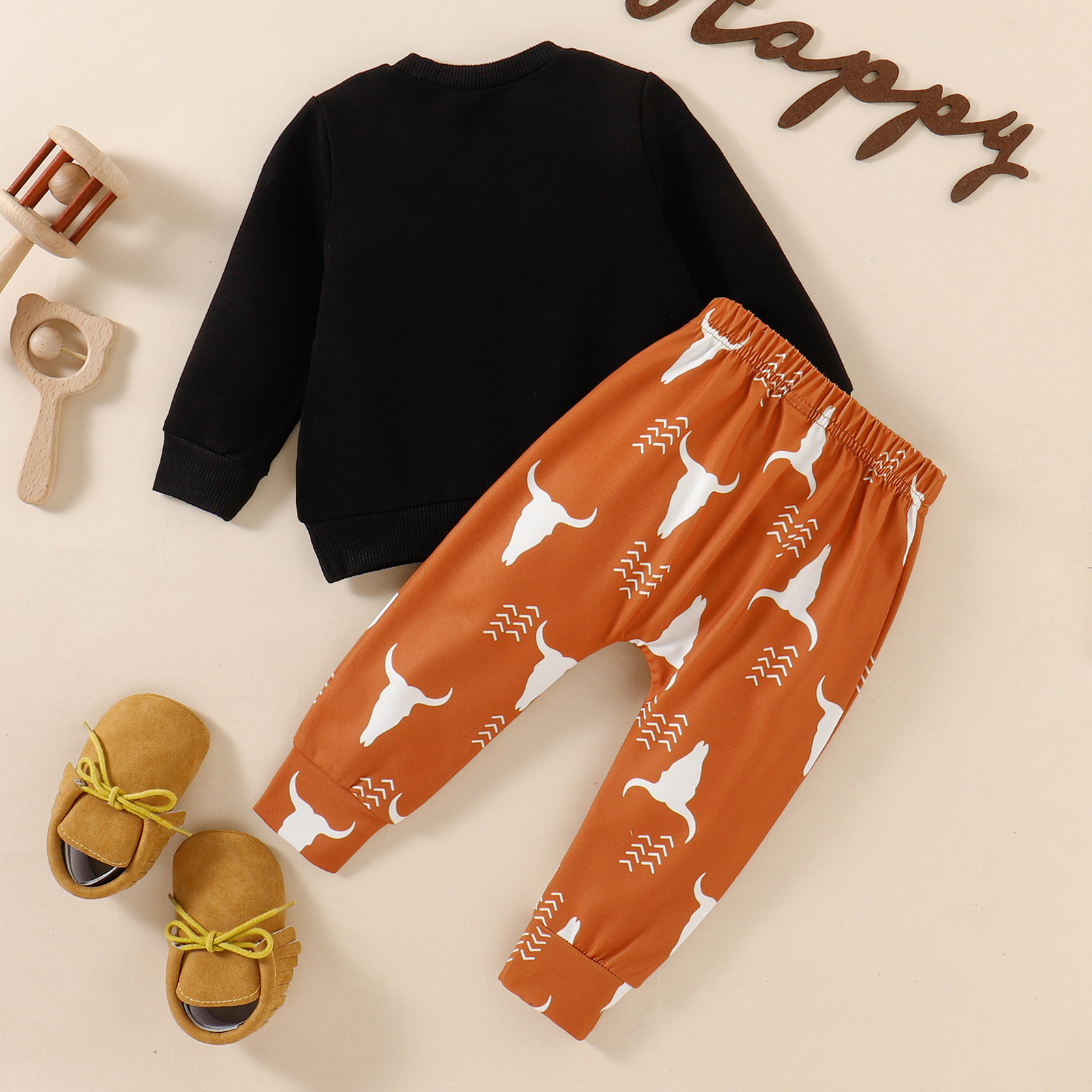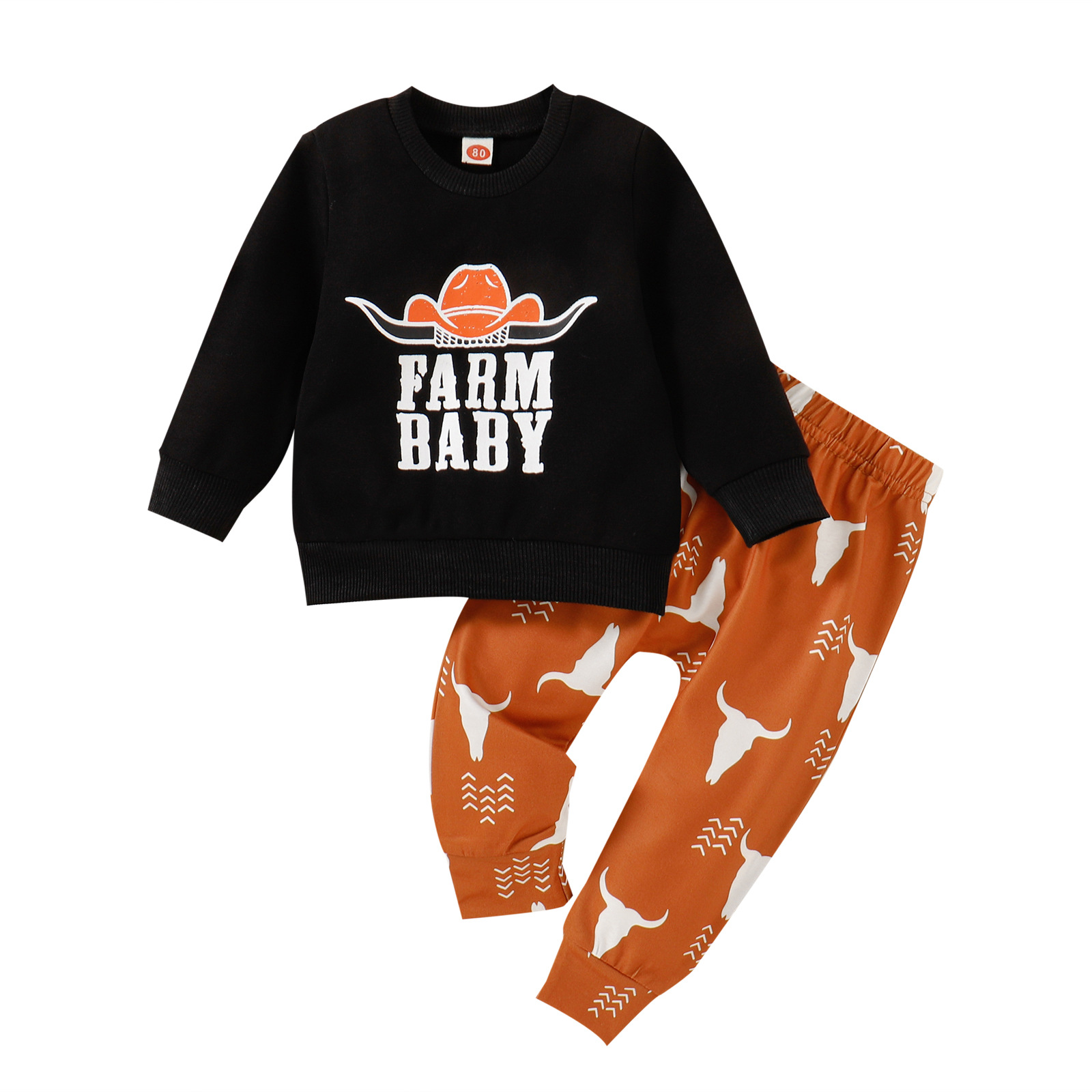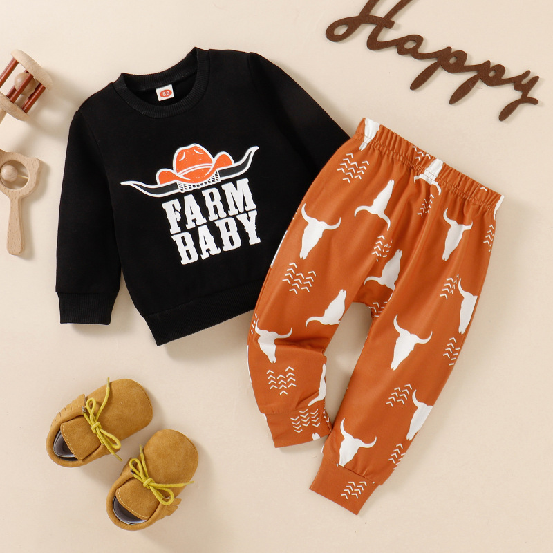Children's Autumn Cow Head Letter Print Pullover Sweater And Trousers Suit