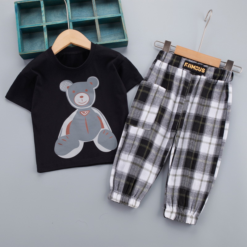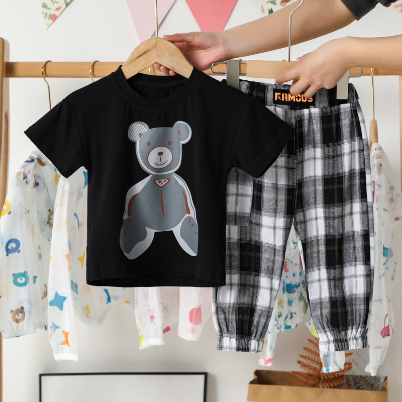 Children's Casual Children's Suit Boys Cartoon Bear T-shirt Short-sleeved Plaid Trousers