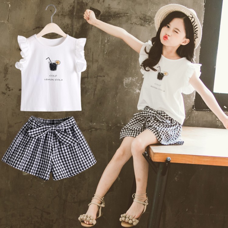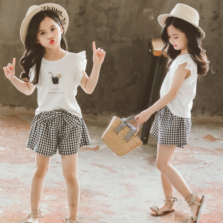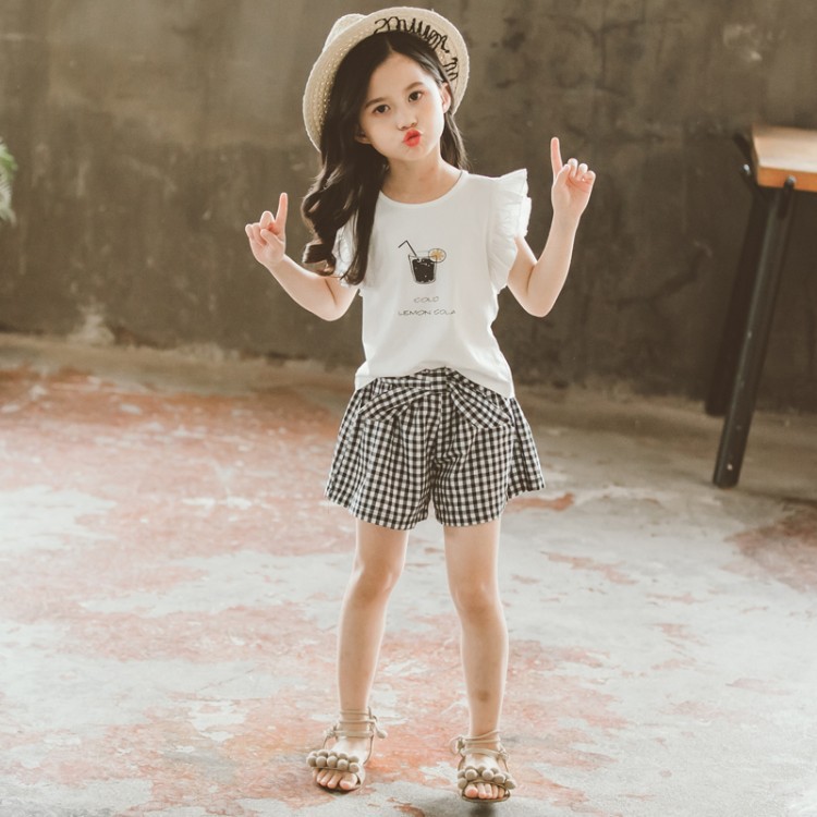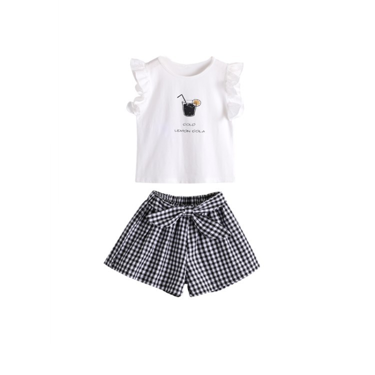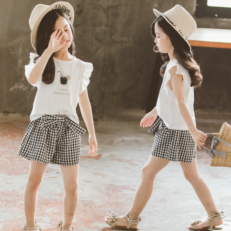 Children's Clothing Girls Suit Short-sleeved Two-piece Korean-style Bow Check Shorts