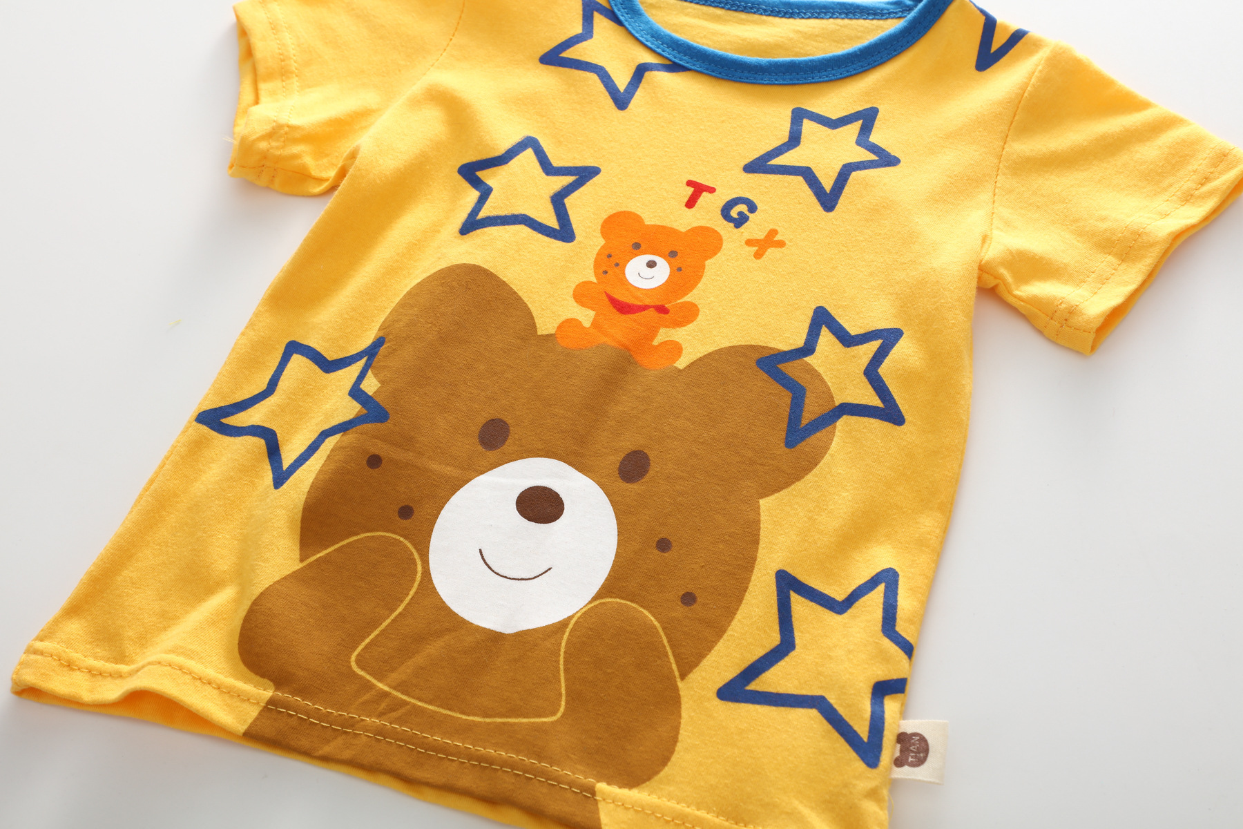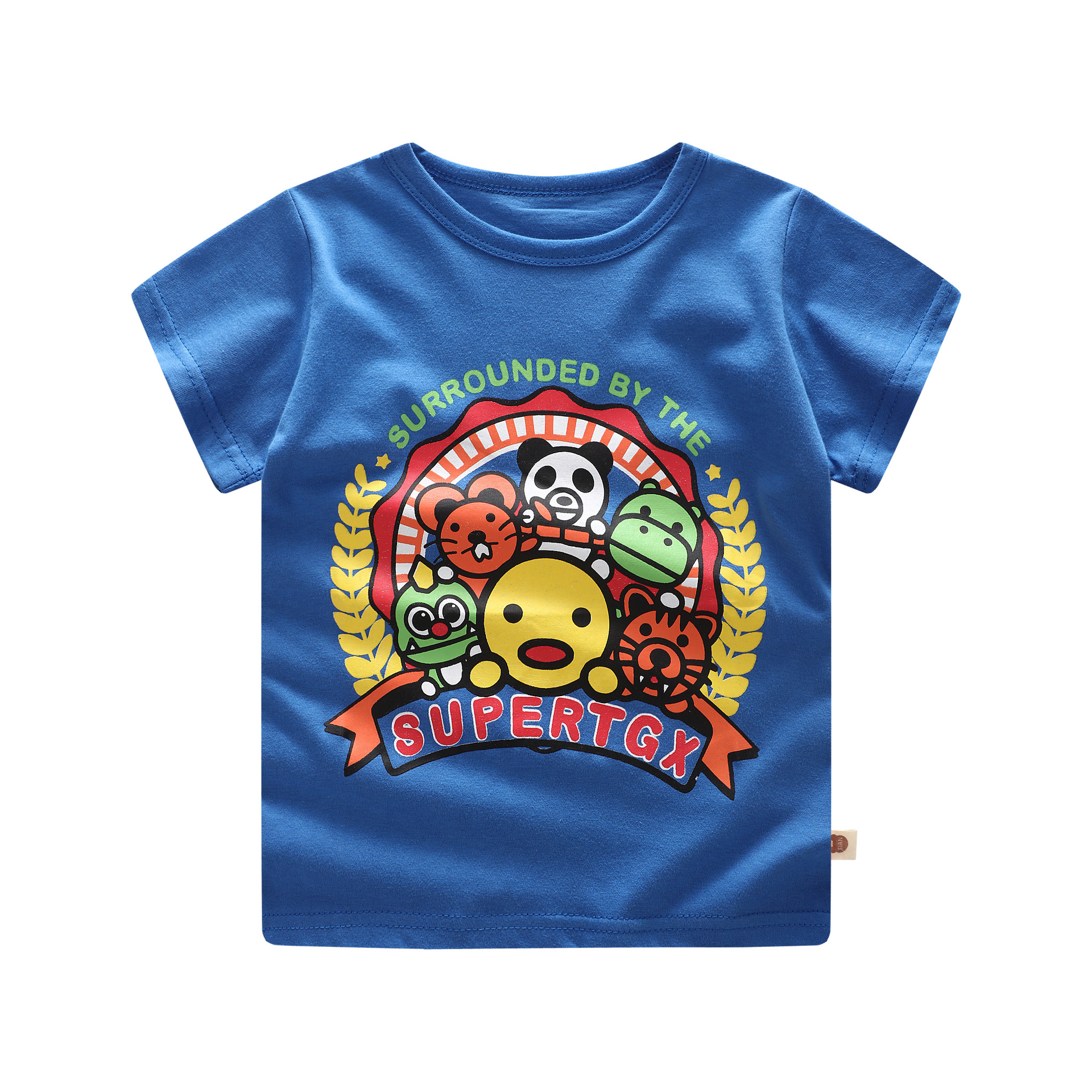 Color: A: yellow bear-compassionate shirt, B: pocket animal-compassionate shirt, C: blue stripe-compassionate shirt, D: blue animal-compassionate shirt, E: blue shark-compassionate shirt