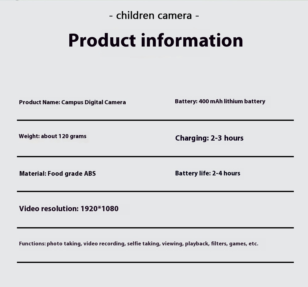 Product information:Name: Campus digital cameraWeight: about 120gMaterial: food grade ABSVideo resolution: 1920*1080