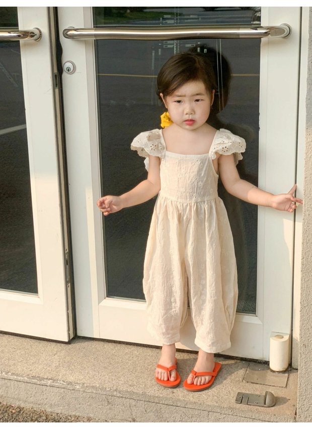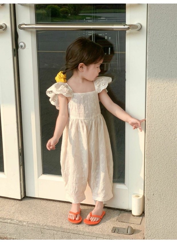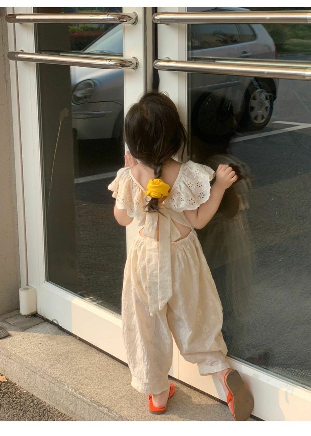 Children's Embroidered Cotton Flounced Sleeve Exposed Back Jumpsuit