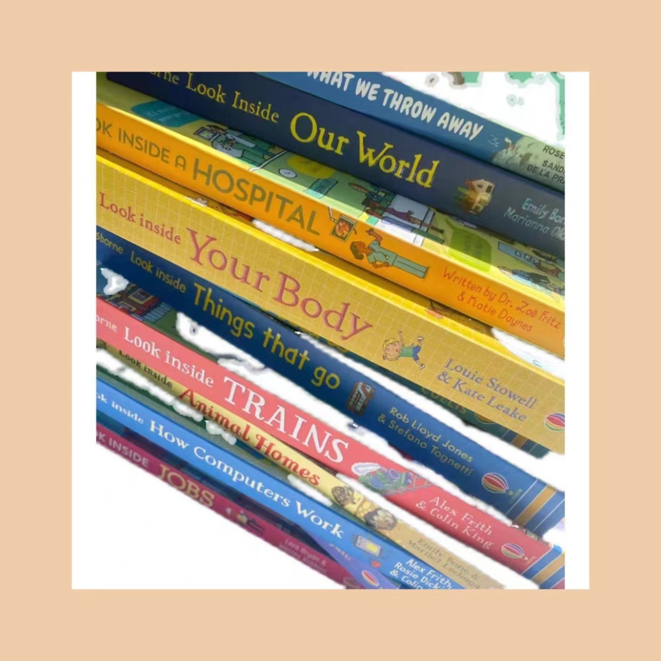 Color: Your body, our world, science, airports, oceans, how computers work, space, moving things, food, trains, cars, animals in danger, how things work, work, animal homes, bad weather, hospitals, coral reefs, volcanoes and earthquakes, things we throw away, construction sites, what happens when you eat, step into science