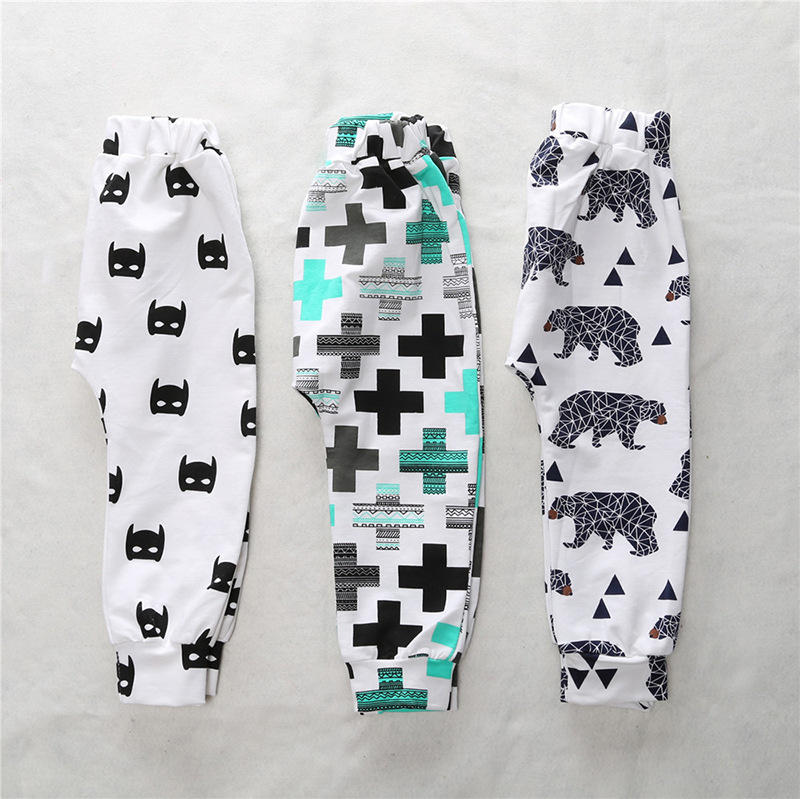 Color: feather-trousers, cloth bag-trousers, green and black cross trousers, black black bear-trousers, little ghost head-trousers, pink cat-trousers, orange Tangram-trousers, blue Tangram-trousers