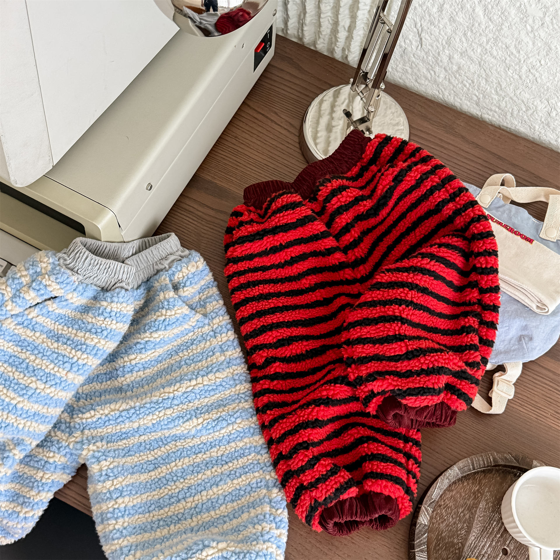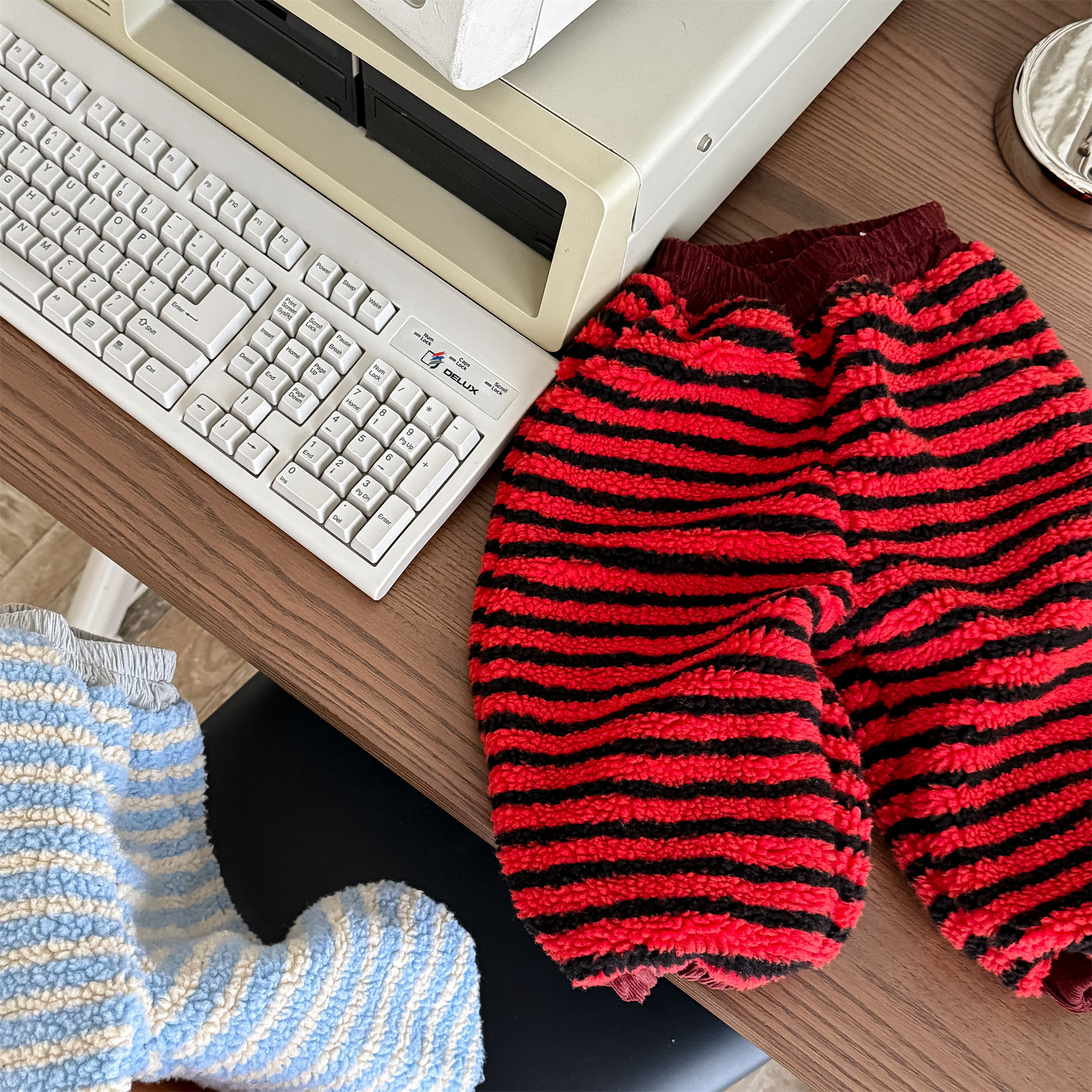 Color: Beige blue stripes, red black stripes