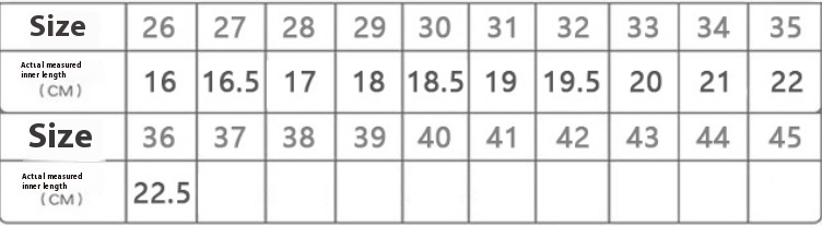 Size: 26 yards inner length 16cm,27 yards inner length cm,28 yards inner length 17cm,29 yards inner length 18cm,30 yards inner length cm,31 yards inner length 19cm, the inner length of 32 yards is cm, the inner length of 33 yards is 20cm, the inner length of 34 yards is 21cm, the inner length of 35 yards is 22cm, and the inner length of 36 yards is cm