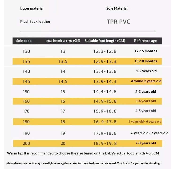 Size: inner length 13cm suitable for foot length 12.3-12.8, inner length 14cm suitable for foot length 13.4-13.8, inner length 15cm suitable for foot length 14.3-cm, inner length 16cm suitable for foot length 14.9-15.8, inner length 17cm is suitable for foot length 15.9-16.8, inner length 18cm is suitable for foot length 16.9-17.8, inner length 13.5cm is suitable for foot length 12.9-13.3, inner length 14.5cm is suitable for foot length 13.9-14.3
