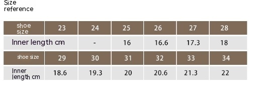 Size: size 23 insole length 15cm, size 24 insole length cm, size 25 insole length 16cm, size 26 insole length cm, size 27 insole length cm, size 28 insole length 18cm, size 29 inner length cm, size 30 inner length cm, size 31 inner length 20cm, size 32 inner length cm, size 33 inner length cm, size 34 inner length 22cm