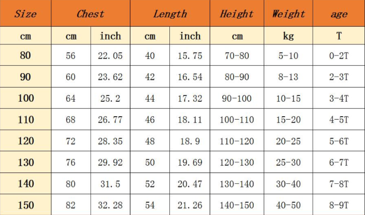 Reference height: Child S Child M Child L Child XL Child 2XL Child 3XL Child 4XL Child 5XL
