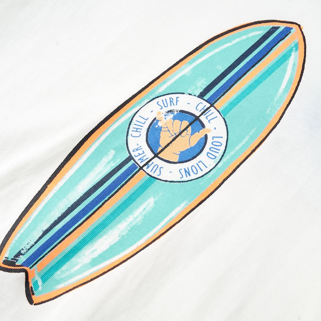 Description: Our children's clothing collection focuses on affordable, high-quality, and durable everyday wear for children aged 1.5 to 10 years. Our range includes jackets, sweaters, shirts, and much more, with a variety of styles, sizes, and colors. This children's t-shirt has short sleeves, a crew neck, and a straight fit. It features a colorful surfboard print on the front. Made from 100% cotton, this short-sleeved shirt feels soft and comfortable against the skin. Finding the right size for your child is easy. Properties: