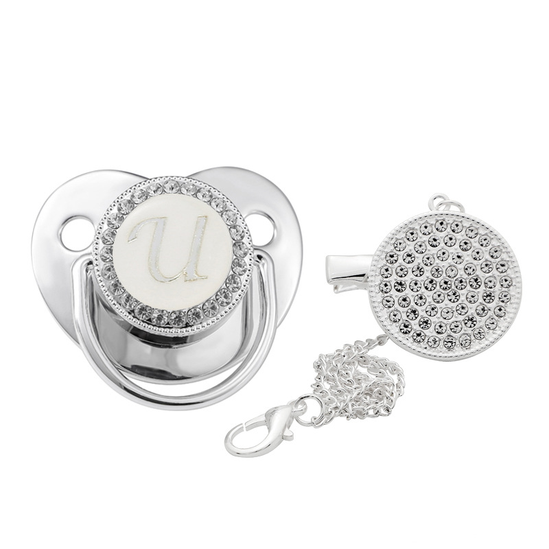 This is a children's silver soothing pacifier baby letters A-Z,