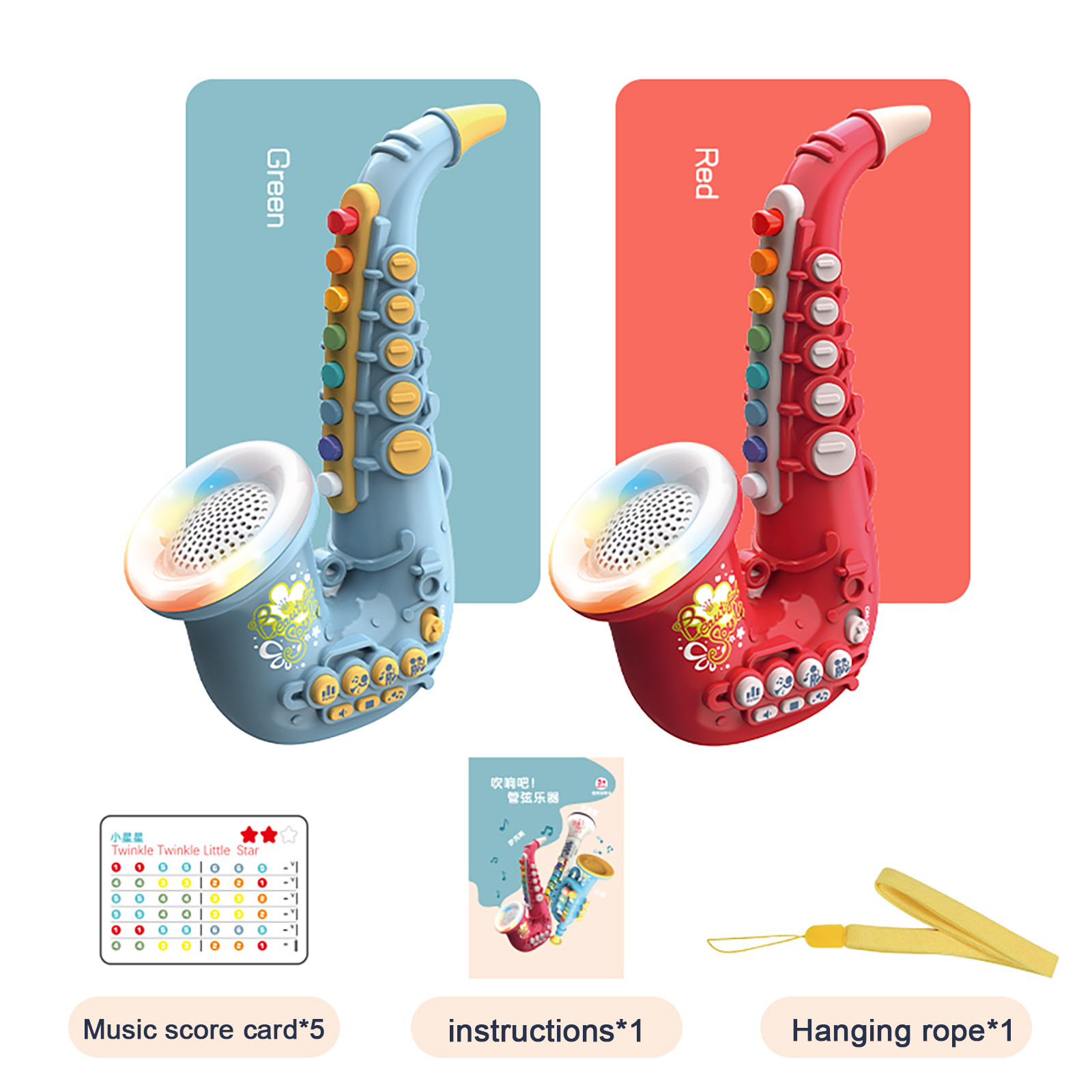 Saxophone color: turquoise green, coral red