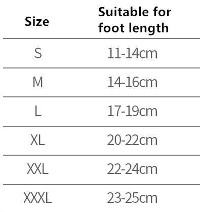 Children's socks size: S recommended foot length 11-14cm for 1-3 years old, M recommended foot length 14-17cm for 3-5 years old, L 6-8 years old recommended foot length 17-19cm, XL 9-12 years old recommended foot length 19- 22cm, size 35-40 for XXL 13 and older, size 39-44 for XXXL adult