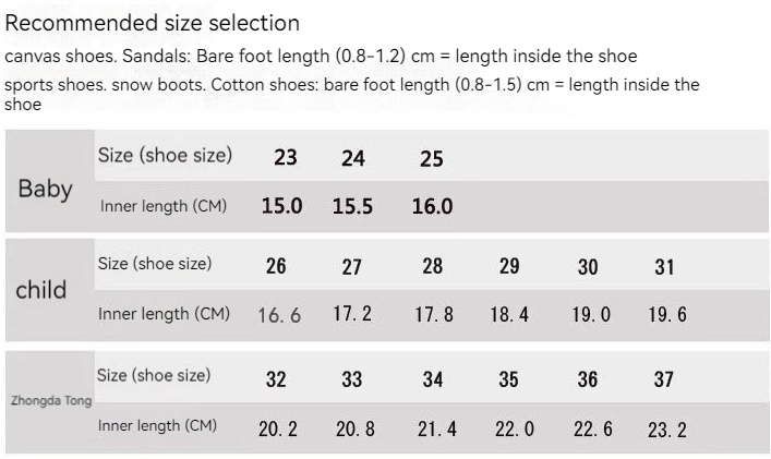 Size: 23 size: 15cm,24 size: cm,25 size: 16cm,26 size: cm,27 size: cm,28 Size: cm,29 size: 18.4,30 size: 19cm,31 size: cm,32 size: cm,33 size: cm,34 size: cm,35 size: 22cm,36 size: 22.6,37 size: 23.2cm