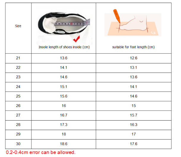 Size: 13.6cm in size 21, 14.1cm in size 22, 14.6cm in size 23, 15.1cm in size 24, 15.6cm in size 25, 16cm in size 26, 16.7cm in size 27, 17.3cm in size 28, 18cm in size 29 and 18.6cm in size 30.