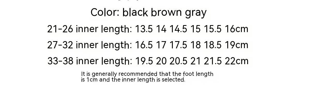 Size: The inner length of no.21 shoes is about cm, the inner length of no.22 shoes is about 14cm, the inner length of no.23 shoes is about cm, the inner length of no.24 shoes is about 15cm, and the inner length of no.25 shoes is about cm, the inner length of No. 26 shoe is about 16cm, the inner length of No. 27 shoe is about cm, the inner length of No. 28 shoe is about 17cm, and the inner length of No. 29 shoe is about cm, the inner length of size 30 shoes is about 18cm, the inner length of size 31 shoes is about cm, the inner length of size 32 shoes is about 19cm, and the inner length of size 33 shoes is about cm, the inner length of size 34 shoes is about 20cm, the inner length of size 35 shoes is about cm, the inner length of size 36 shoes is about 21cm, and the inner length of size 37 shoes is about cm, the inner length of No. 38 shoes is about 22cm