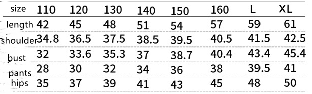Size: 110 size is suitable for 100cm height, 120 size is suitable for 110cm height, 130 size is suitable for 120cm height, 140 size is suitable for 130cm height, 150 size is suitable for 140cm height, 160 size is suitable for 150cm height, L size is suitable for 160cm height, XL size is suitable for 165cm height