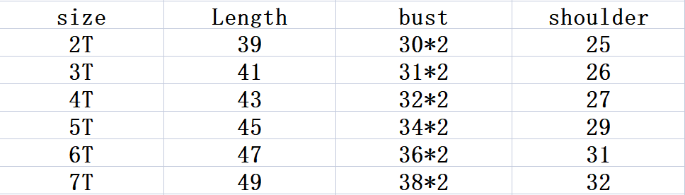 Size: 2T/90CM,3T/95CM,4T/100CM,5T/110CM,6T/120CM,7T/130CM