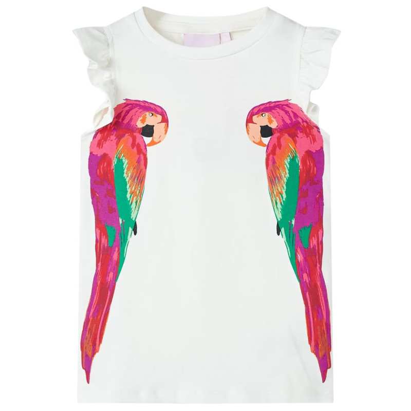 Description: Our children's clothing collection focuses on affordable, high-quality, and durable everyday wear for children aged 1.5 to 10 years. Our range includes jackets, sweaters, shirts, and much more, with a variety of styles, sizes, and colors. This sleeveless children's t-shirt features a crew neck, cute ruffles at the shoulders, and a straight cut. The t-shirt is printed with adorable parrots. Finding the right size for your child is easy. Properties: