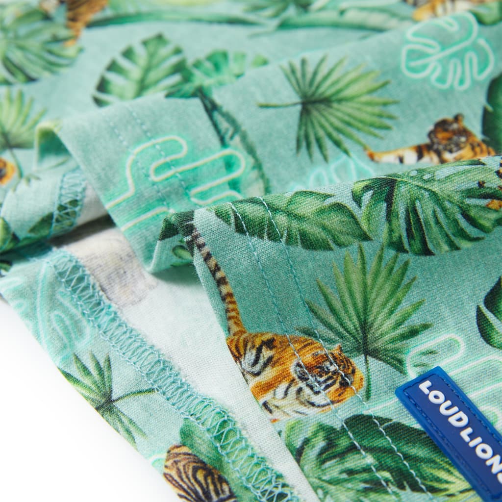 Description: Our clothing line includes affordable, high-quality, and durable everyday wear for children aged 1.5 to 10 years. Our range includes jackets, sweaters, shirts, and much more, available in various styles, sizes, and colors. To meet the high quality standards in the market, we use premium materials and advanced manufacturing techniques. This children's t-shirt has short sleeves, a crew neck, and a straight fit. The t-shirt is printed with tigers and plants. This makes it easy to find the right size for your child. Properties:
