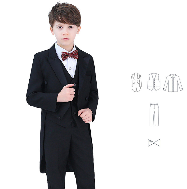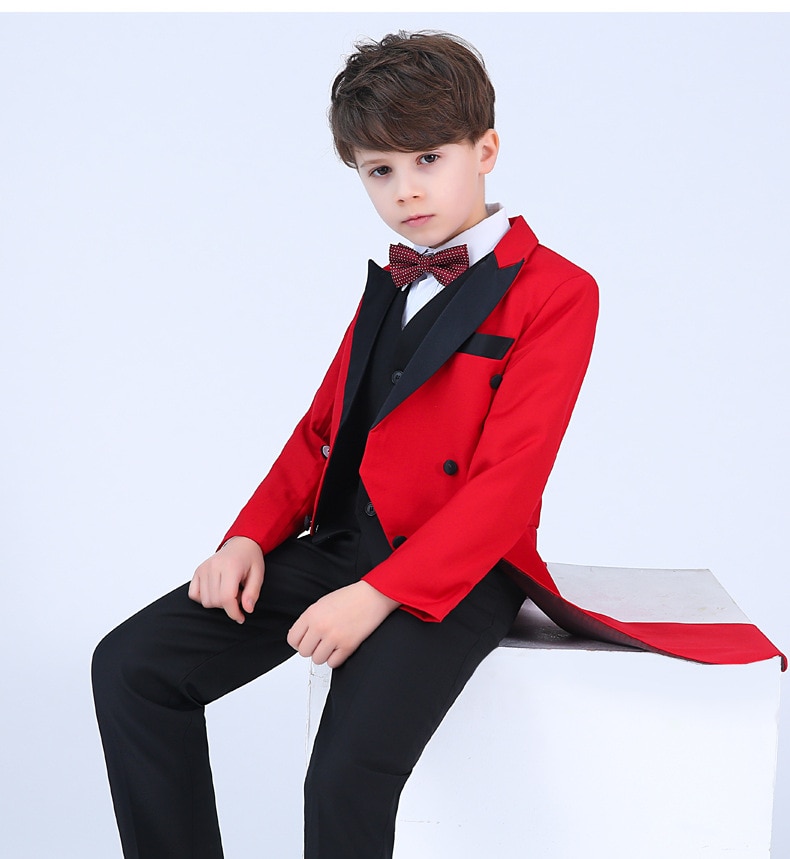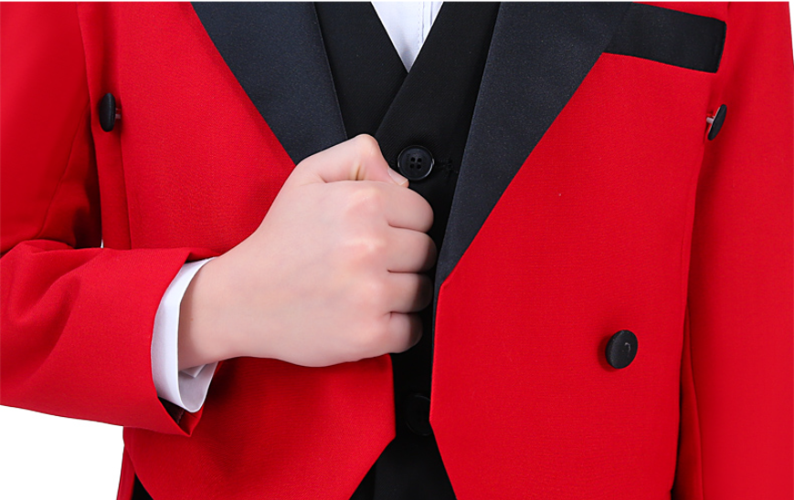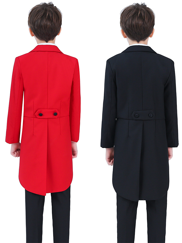 Color: 4-piece black dovetail set (black jacket + black pants + shirt + bow tie), 5-piece black dovetail set (black jacket + black vest + black trousers + shirt + bow tie), 4-piece red dovetail set (red jacket + black trousers) + shirt + bow tie), red dovetail 5-piece set (red jacket + black vest + black pants + shirt + bow tie)