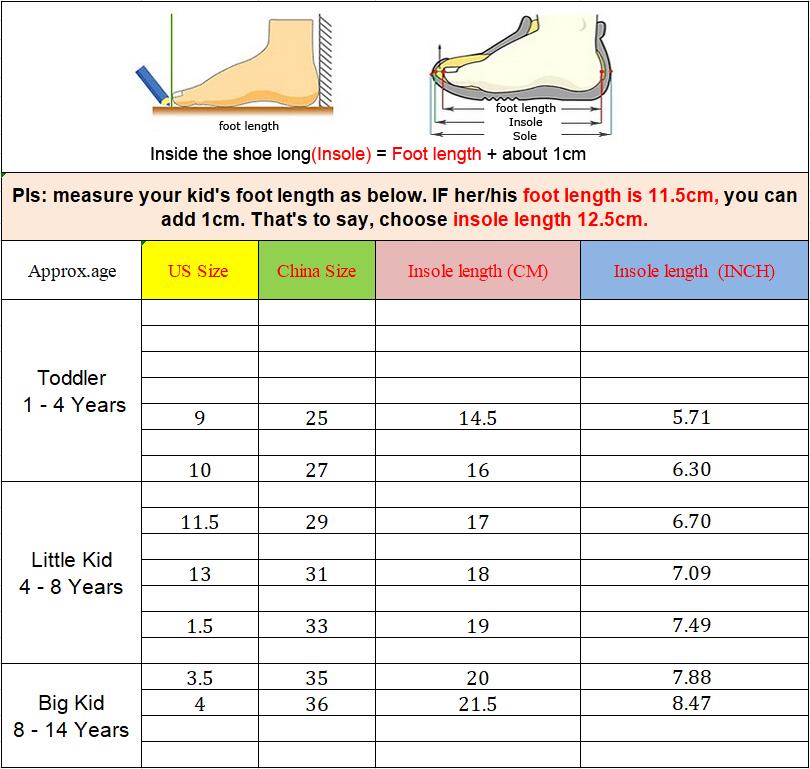 Size: 24-25 (recommended foot length 13.5cm), 26-27 (recommended foot length 15cm), 28-29 (recommended foot length 16cm), 30-31 (recommended foot length 17cm), 32-33 (recommended foot length 18cm), 35-36 (recommended foot length 20cm), 34-35 (recommended foot length 19cm)