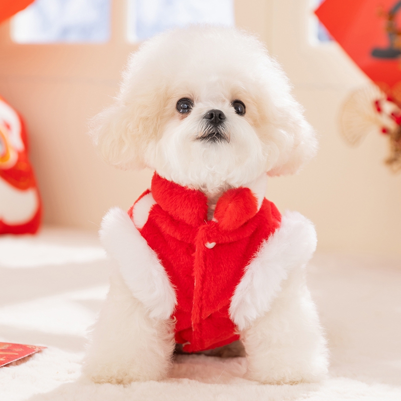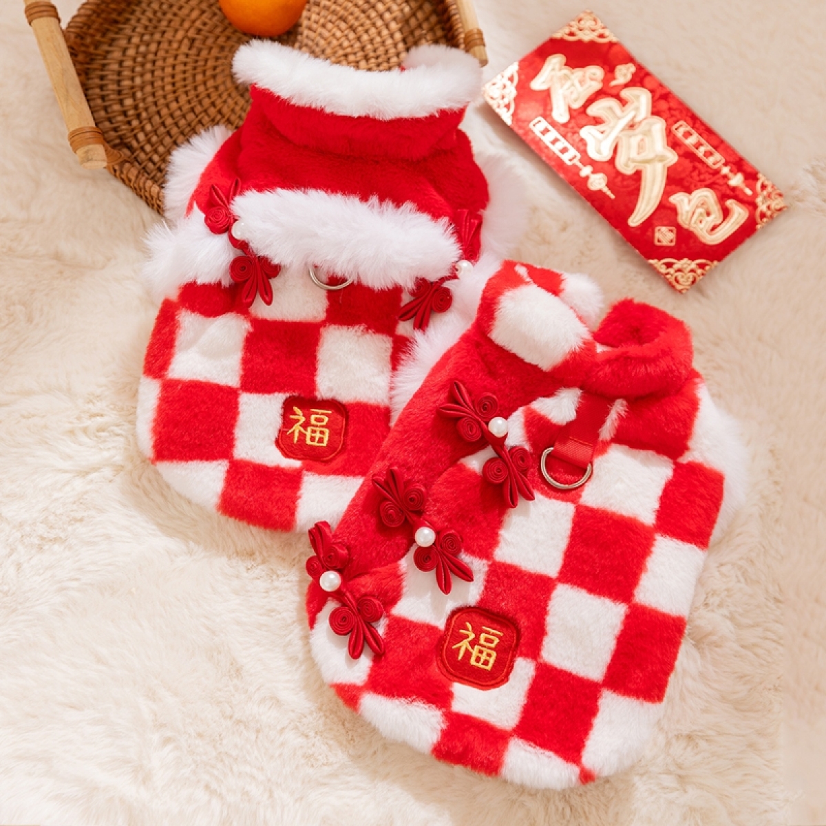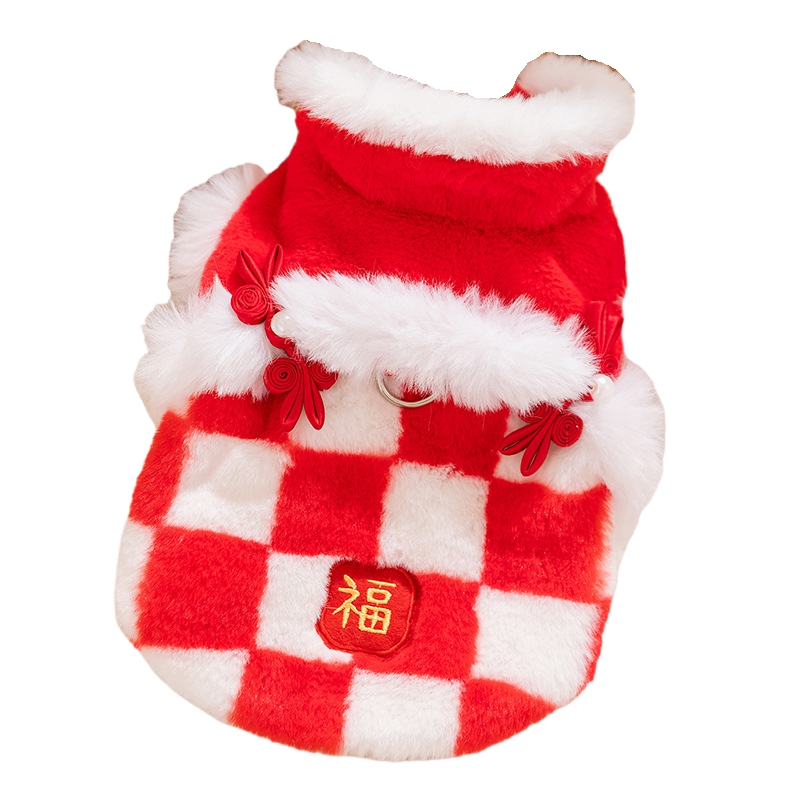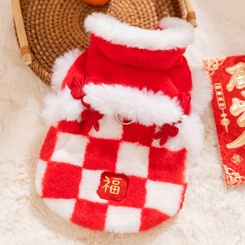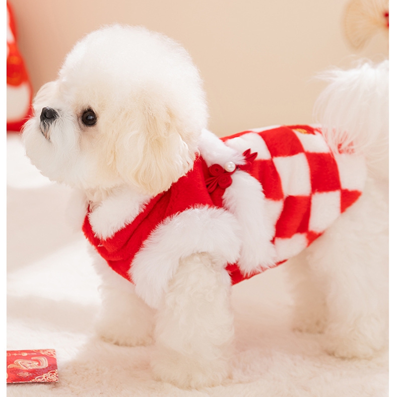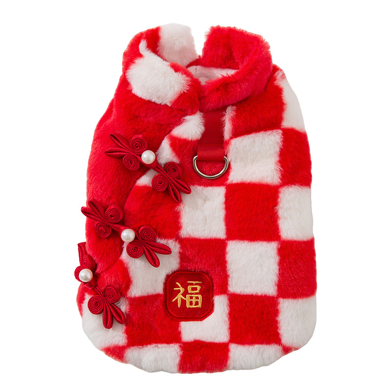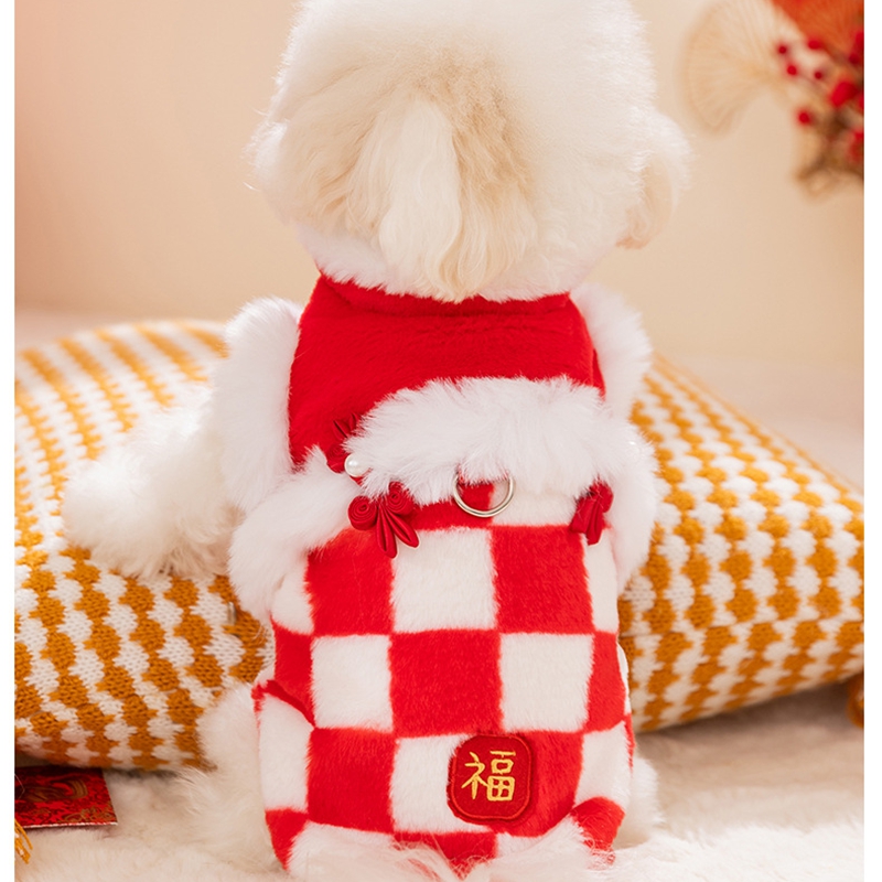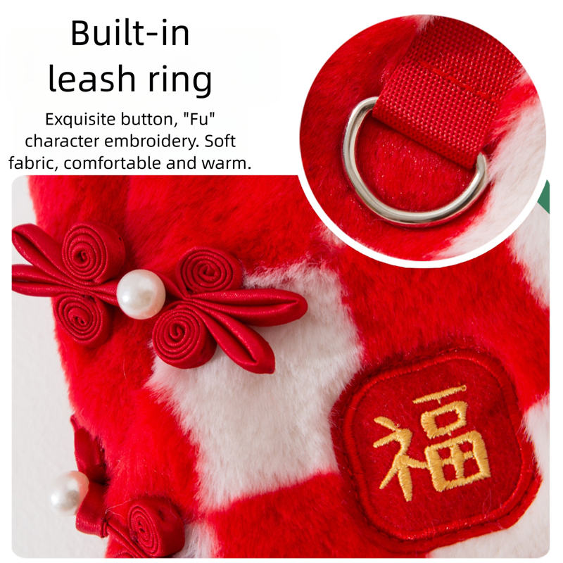 Bring good fortune and festive charm to your pet with this Chinese New Year Checkered Pet Vest! Featuring a red-and-white checkered plush design, traditional Qipao knot buttons with pearl accents, and a golden "Fu"  embroidery, it’s perfect for Lunar New Year celebrations. The soft, cozy fabric ensures warmth, while the integrated leash ring adds practicality for holiday walks. Ideal for festive gatherings or cultural events, this vest combines traditional Chinese elements with comfort, making your furry companion the center of holiday joy and style. A must-have for pet parents wanting to embrace Lunar New Year traditions with their beloved pets!