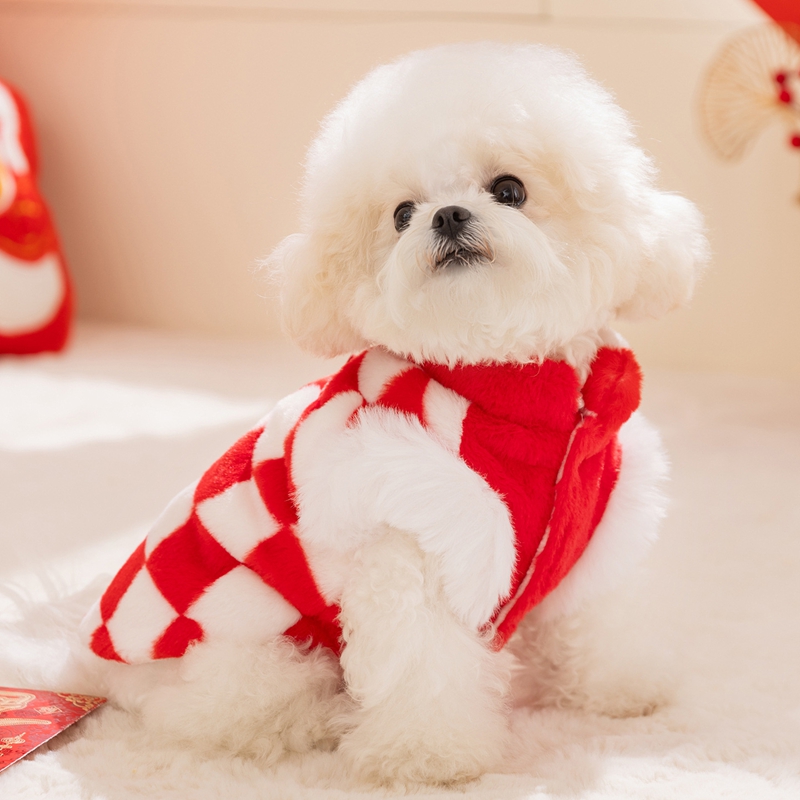 Chinese New Year Checkered Pet Vest With Luck Symbol, Plush Red White Dog Jacket With Qipao Knots For Lunar New Year