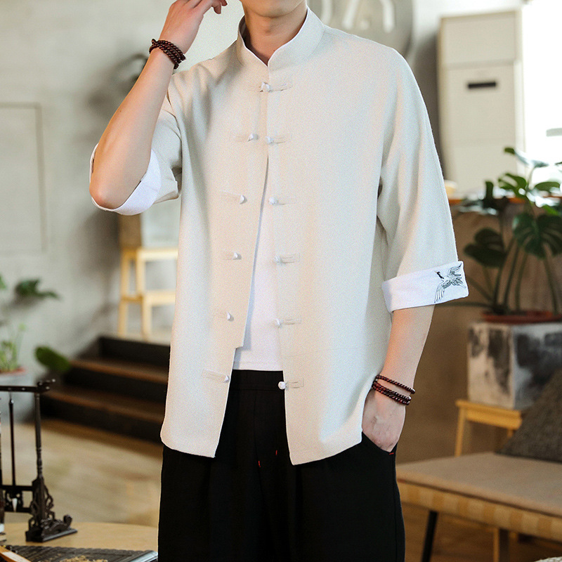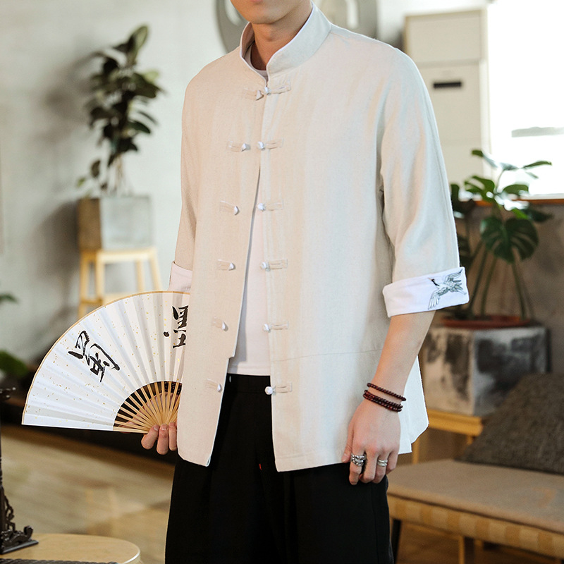 Chinese Style Retro Men's Buckle Hanfu Stand-up Collar 34 Sleeve Cotton And Linen Casual Shirt