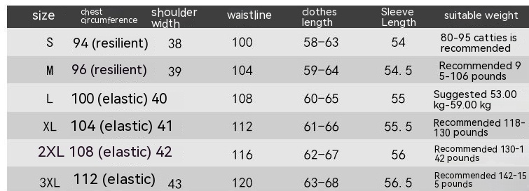 Size: S recommended less than 35.00 kg-47.50 kg, M recommended 47.50 kg-53.00 kg, L recommended 53.00 kg-59.00 kg, XL recommended 59.00 kg-65.00 kg, 2XL recommended 65.00 kg-71.00 kg, 3XL recommended 71.00 kg-77.50 kg, 4XL recommended 77.50 kg-84.00 kg