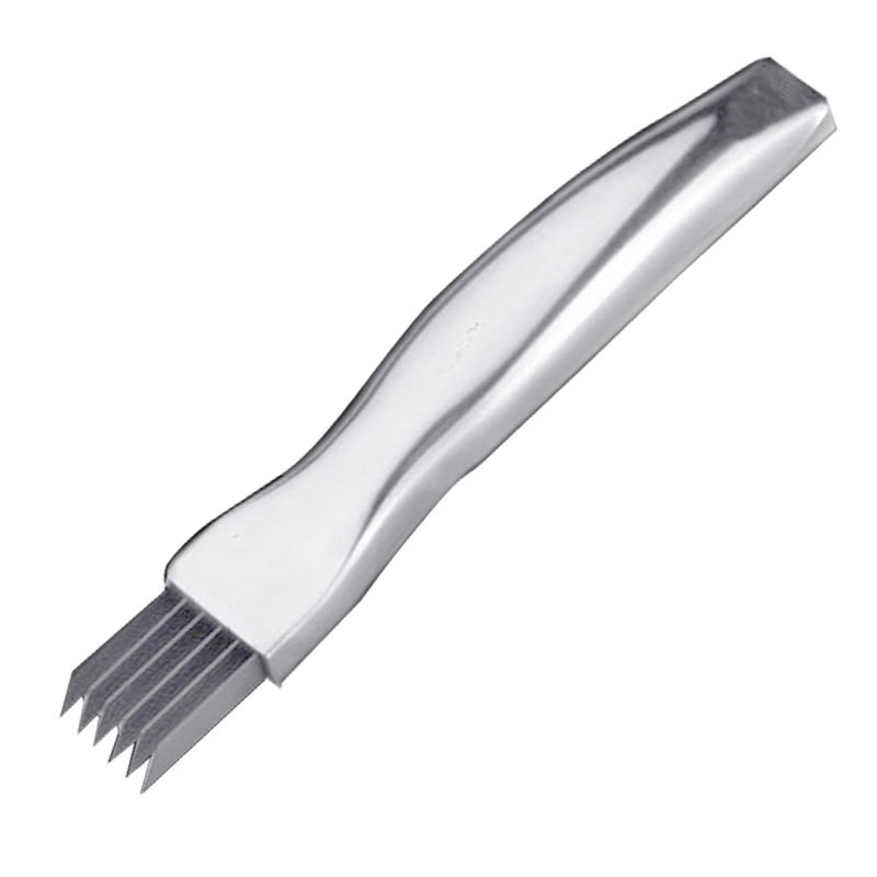 Overview: Place the tool on the scallion. Cut a few times along the line to cut the onion.
