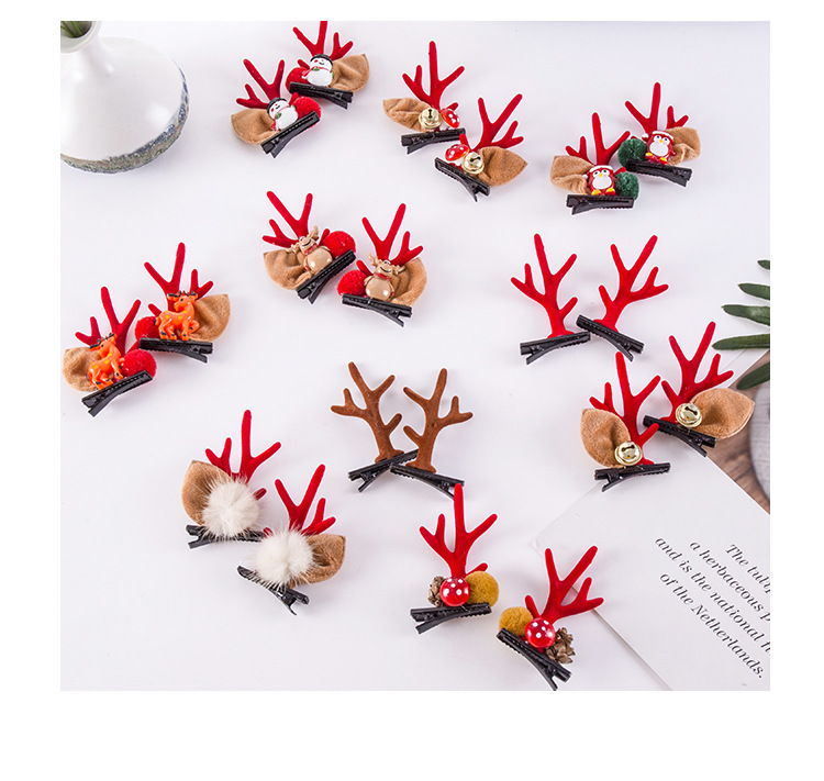 Color: #1 Snowman pair new barrettes,#2 Santa Claus head pair barrettes,#3 elk pair barrettes,#4 new red antlers pair barrettes,#5 pine cone pair new barrettes,#6 new brown antlers pair barrettes,#7 red antlers mink hair pair barrettes New,#8 penguin pair barrettes New,#9 Bell pair barrettes,#10 mushroom bell pair barrettes,#11 waving Santa Claus pair barrettes,#12 Brown Deer pair barrettes,#13 jingle bell pair barrettes,#14 brown deer head pair barrettes,#15 Christmas tree pair barrettes,#16 coffee antlers mink hair pair barrettes New,#17 red and green colorful ball pair barrettes,#18 Wht pair barrettes New