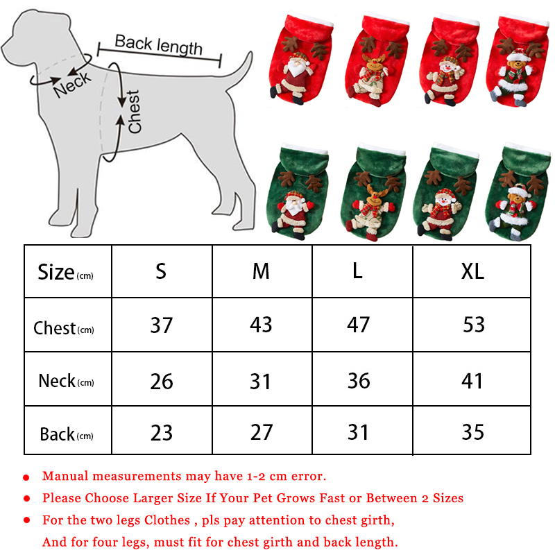 This Christmas Costume Design for Small to Medium dogs, pleasemeasure your pets correctly and check the size chart before shopping.If there is a difference between the neck and the chest, follow the chesisize.And we recommend that you can buy a bigger size if your dog isbetween