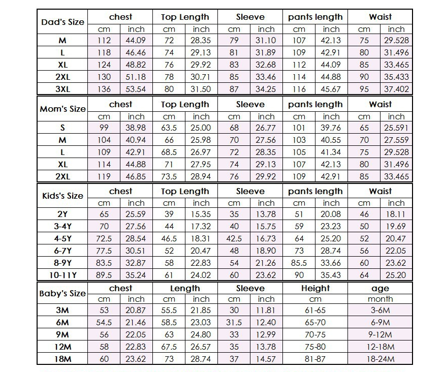 Mom-S, Mom-M, Mom-L, Mom-XL, Mom-2XL, Dad-M, Dad-L, Dad-XL, Dad-2XL, Dad-3XL, Child-2Y, Child-3-4Y, Child-4-5Y, Child-6-7Y, Child-8-9Y, Child-10-11Y, Romper-3M, Romper-6M, Romper-9M, Romper-12M, Romper-18M