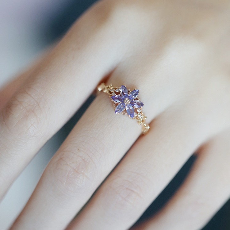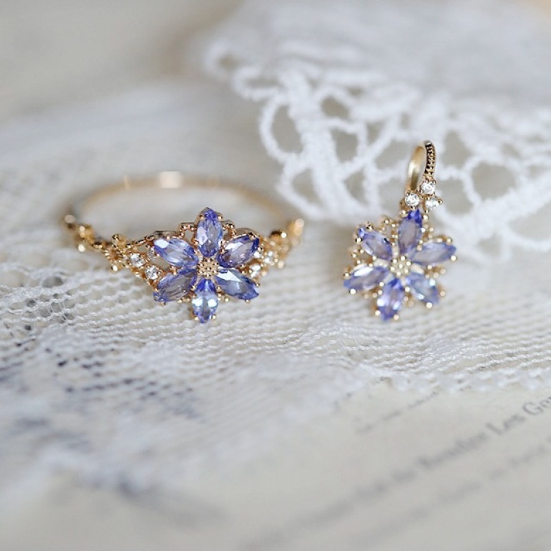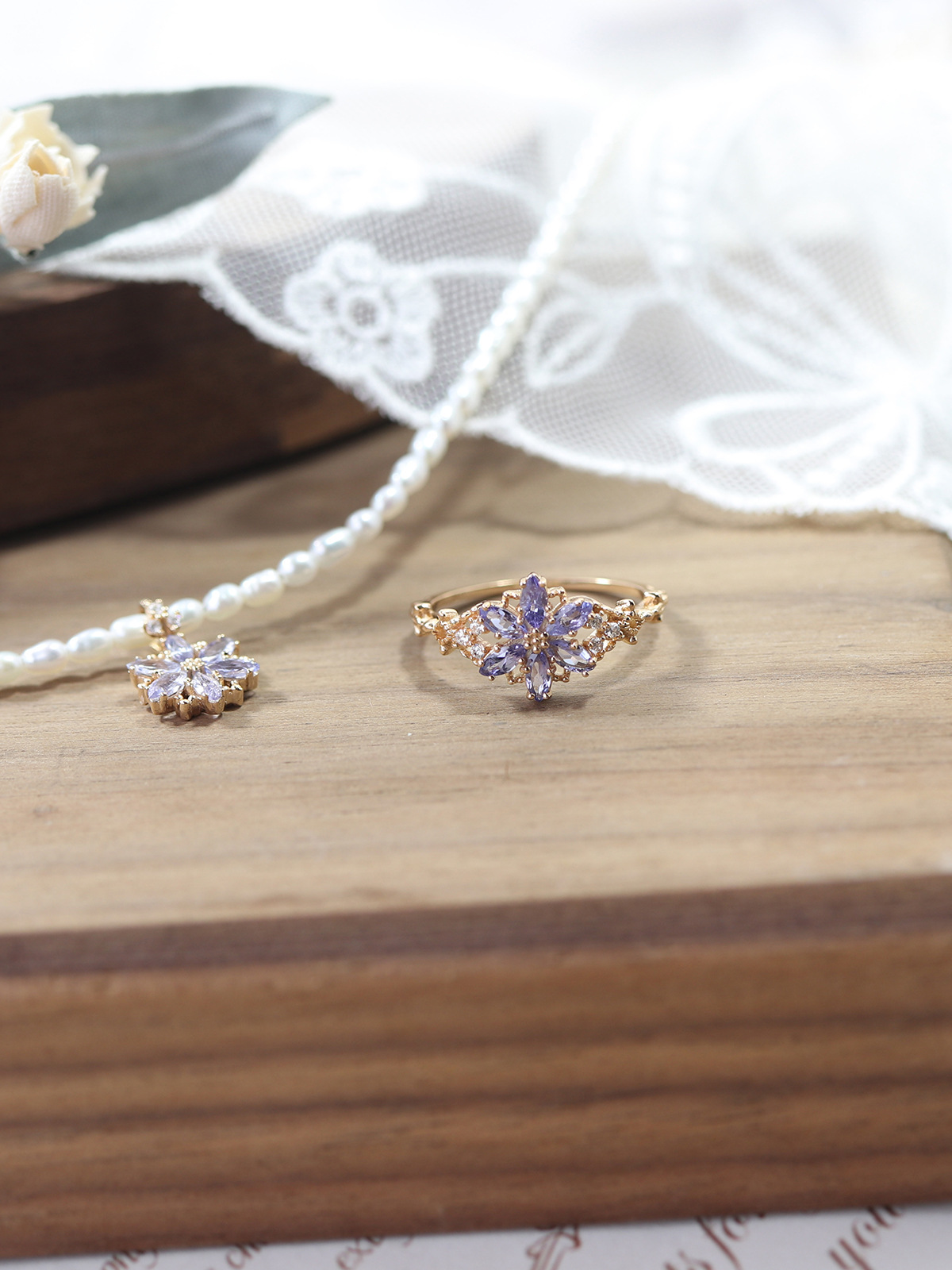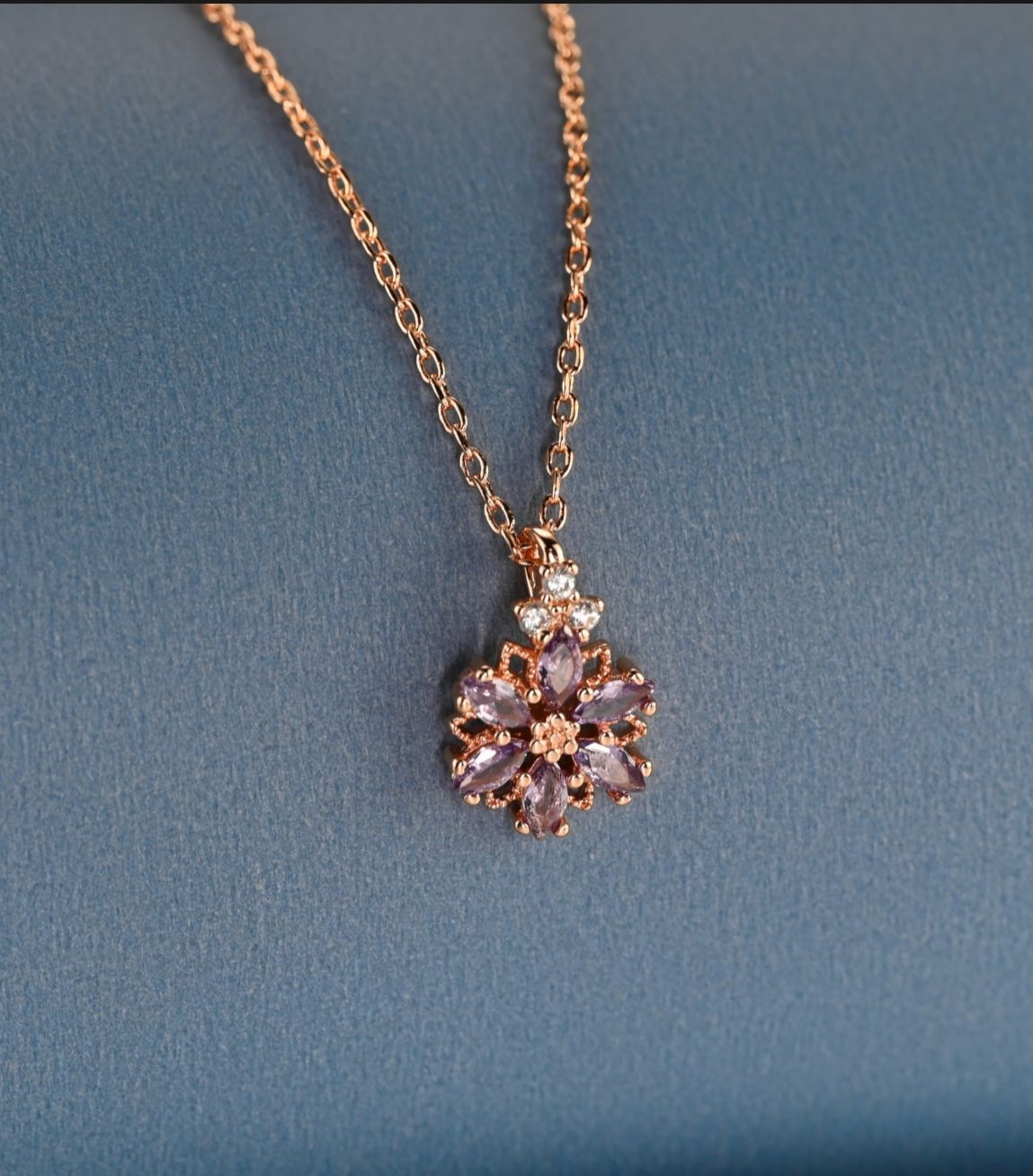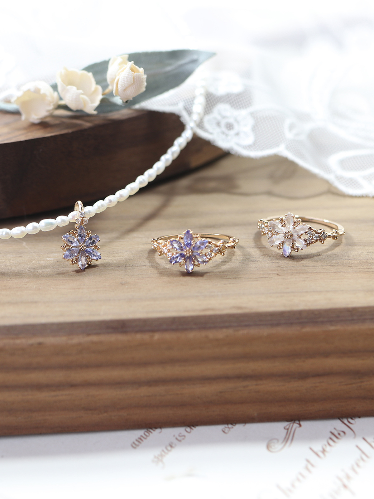 Colors: Adjustable Ring with White Zircon, Adjustable Ring with Purple Zircon, Necklace 40+5, Purple Stone Snowflake Necklace