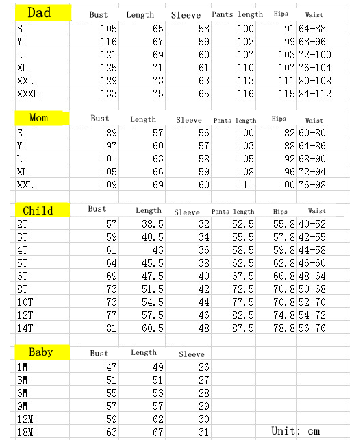 Size: Mom s, Mom M, Mom L, Mom XL, Dad s, Dad m, Dad L, Dad XL, Dad XXL, Child 2, Child 3, Child 4, Child 5, Child 6, Child 8, Child 10, Child 12, Child 14, Baby 3, Baby 6, Baby 9, Baby 12, Baby 18