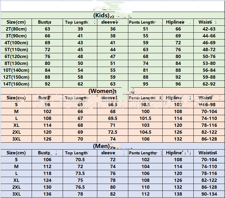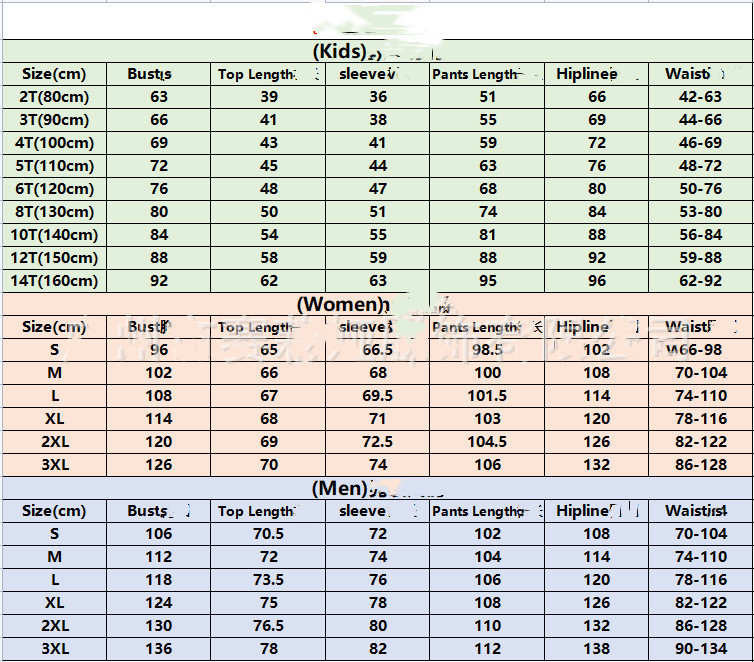 Suitable height: children 2T-80, children 3T-90, children 4T-100, children 5T-110, children 6T-120, children 8T-130, children 10T-140, children 12T-150, children 14T-160,S is Mother, Mother M, mother size L, mother XL, mother 2XL, mother 3XL, father size, father size, Father L, father XL, father 2XL, father 3XL