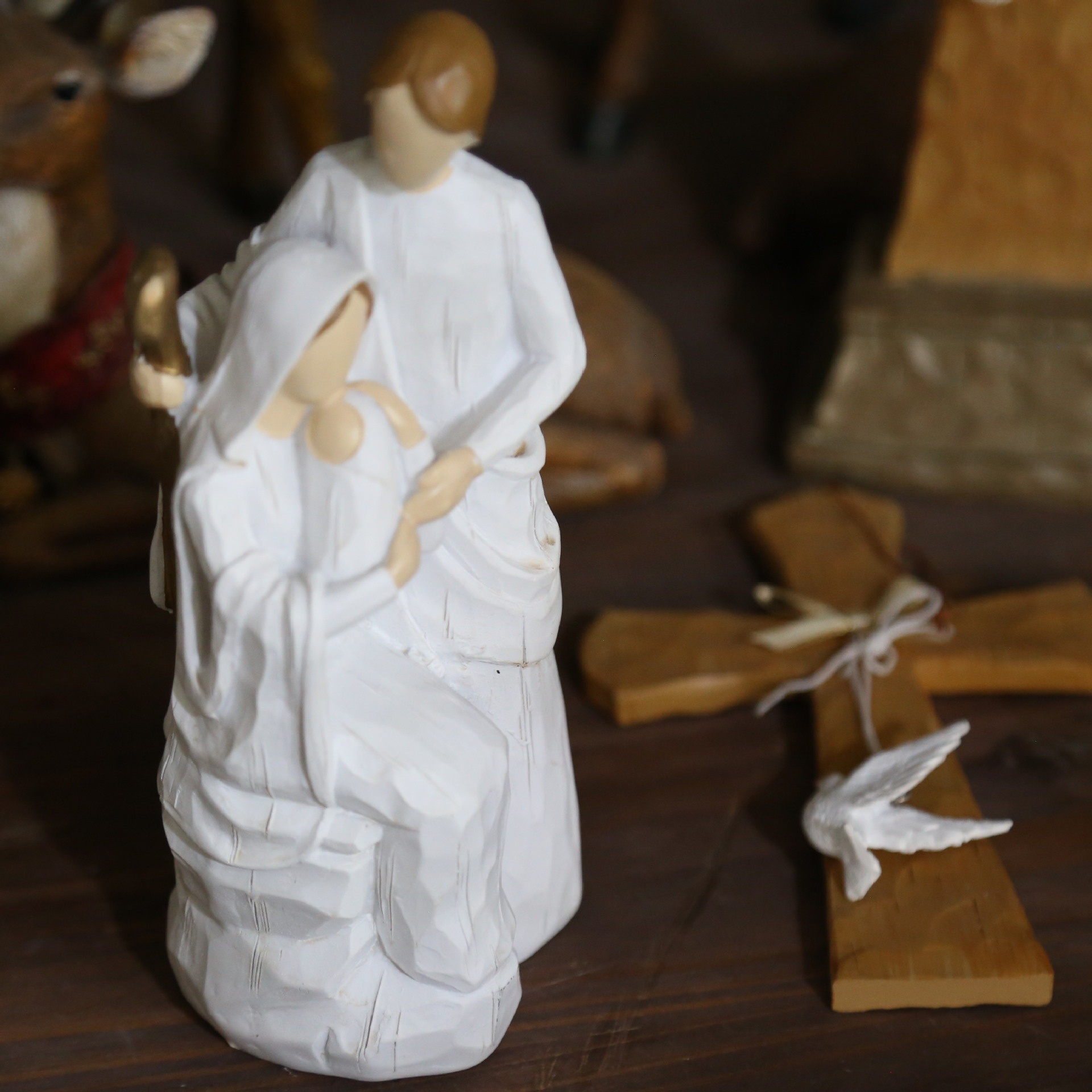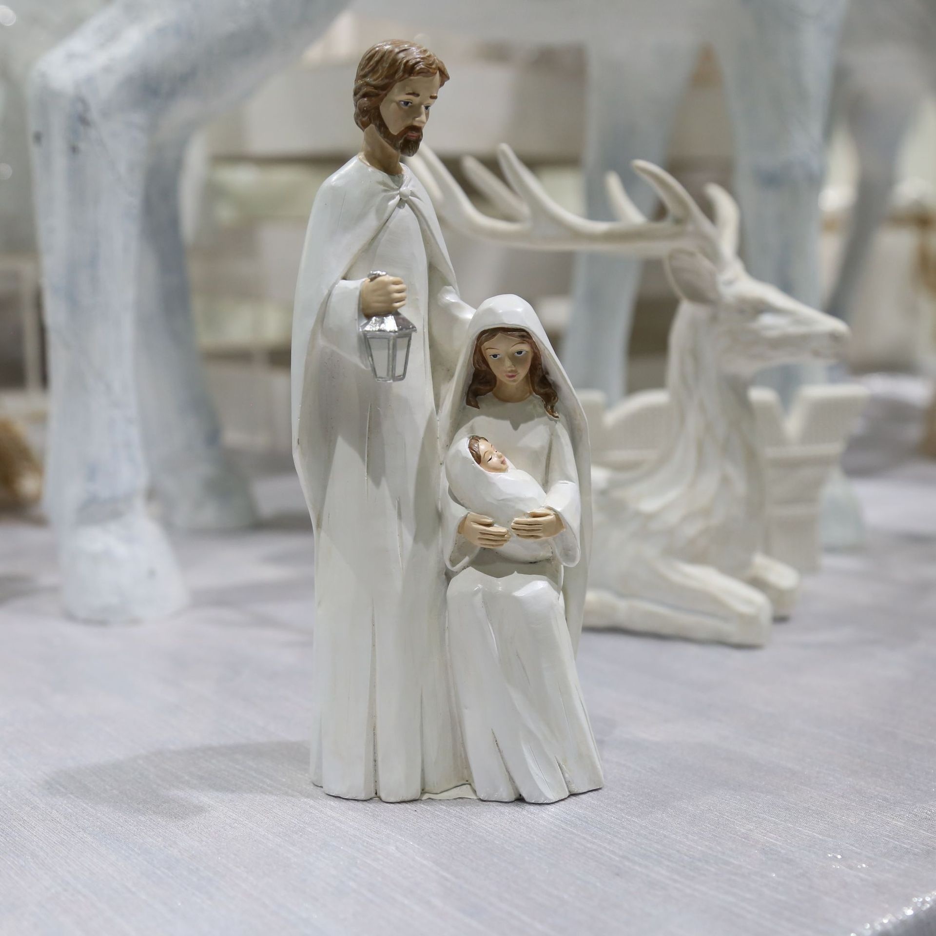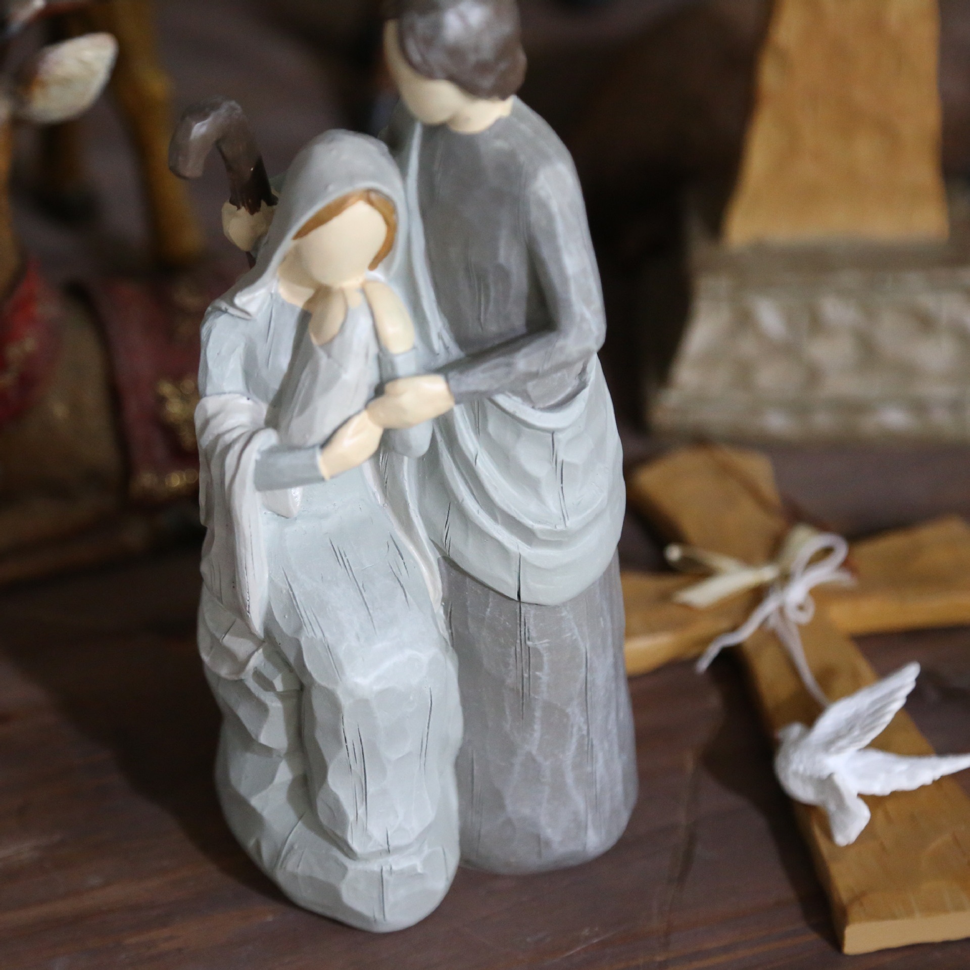 Color: gray woodcut sacred family, Virgin holding Saint baby, beige woodcut sacred family, gray woodcut family, White woodcut family, gray and white