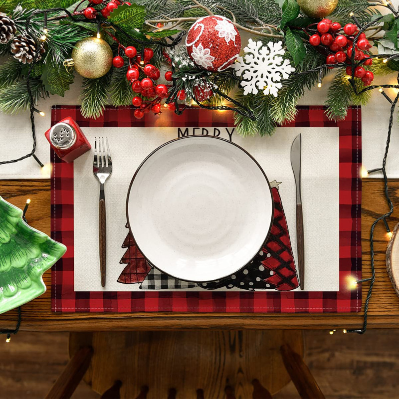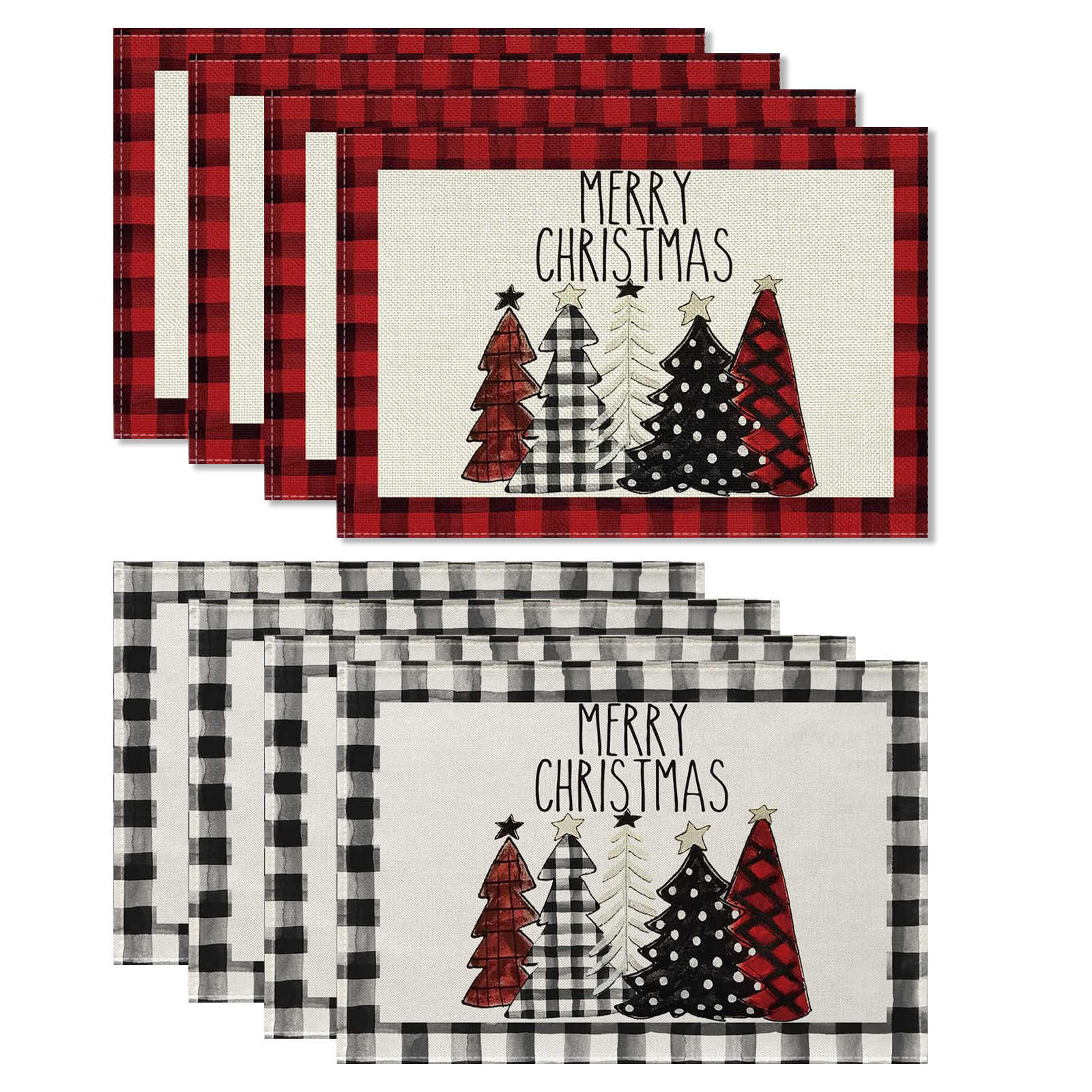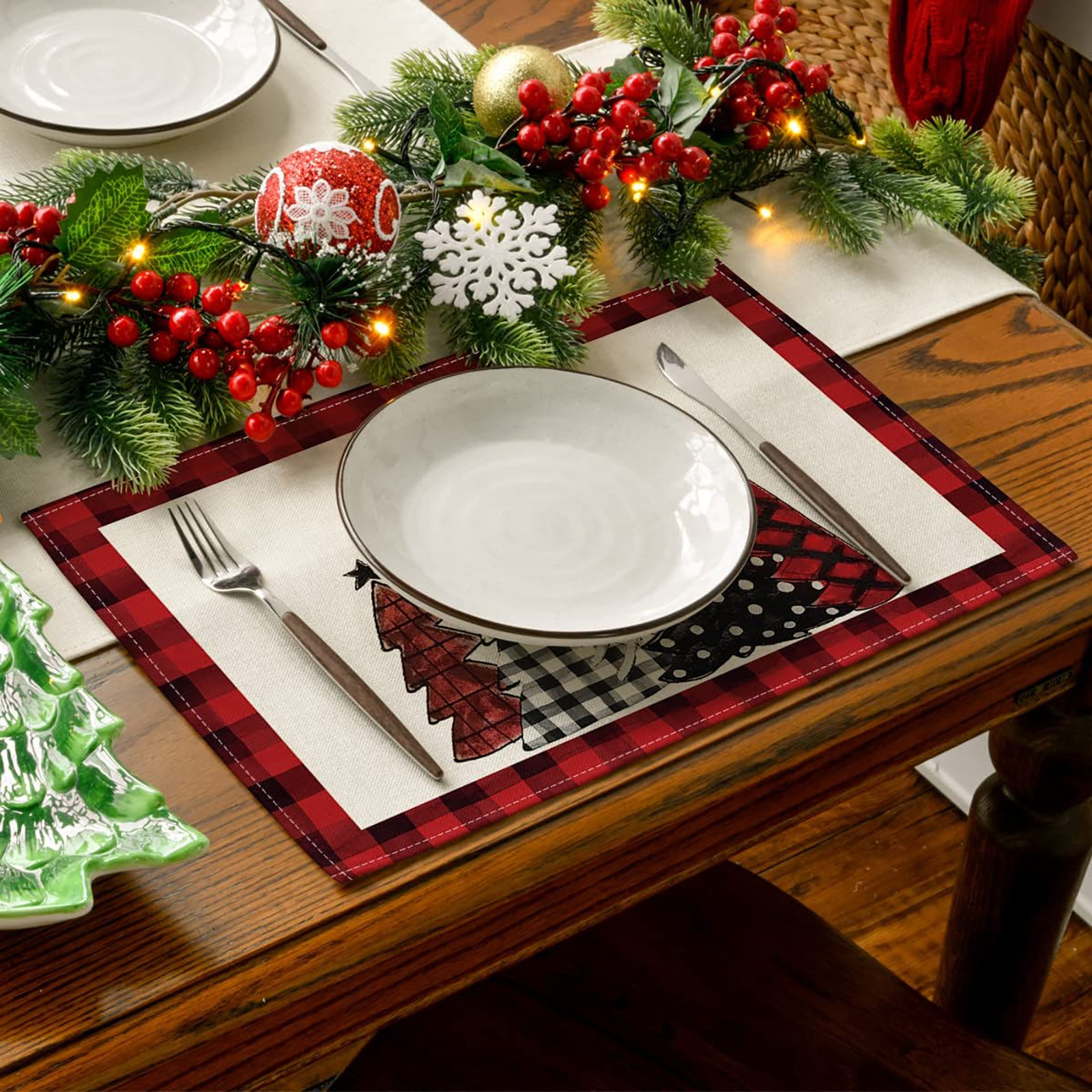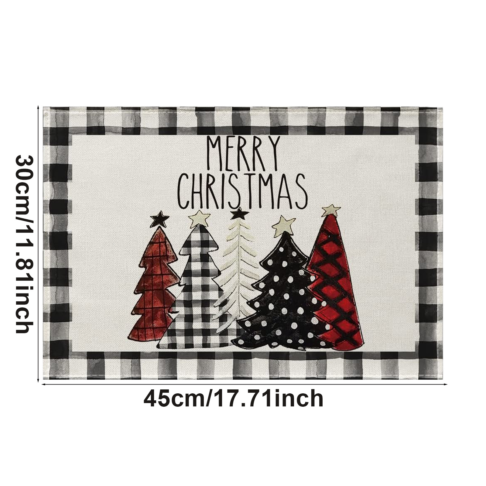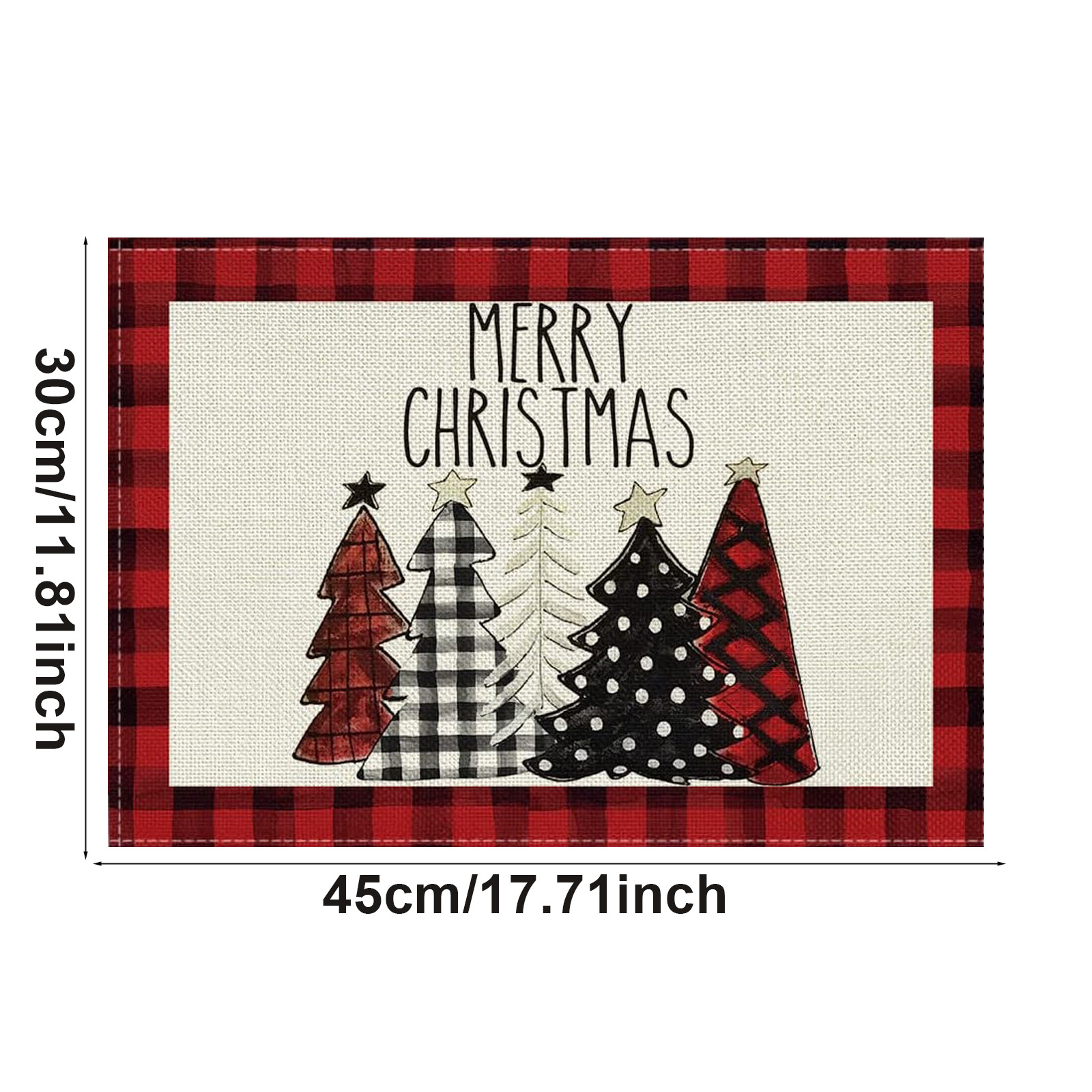 Color: red and black plaid Christmas tree placemat, black and white grid Christmas tree placemat