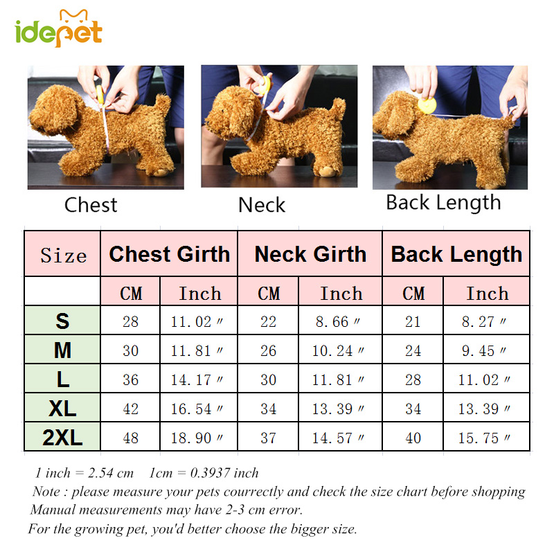 The size of clothes may have an error of 1-3cm. Considering the factors of dog's hair, be sure to measure the size of the dog (it is recommended to widen the measurement by 1 ~ 2cm)