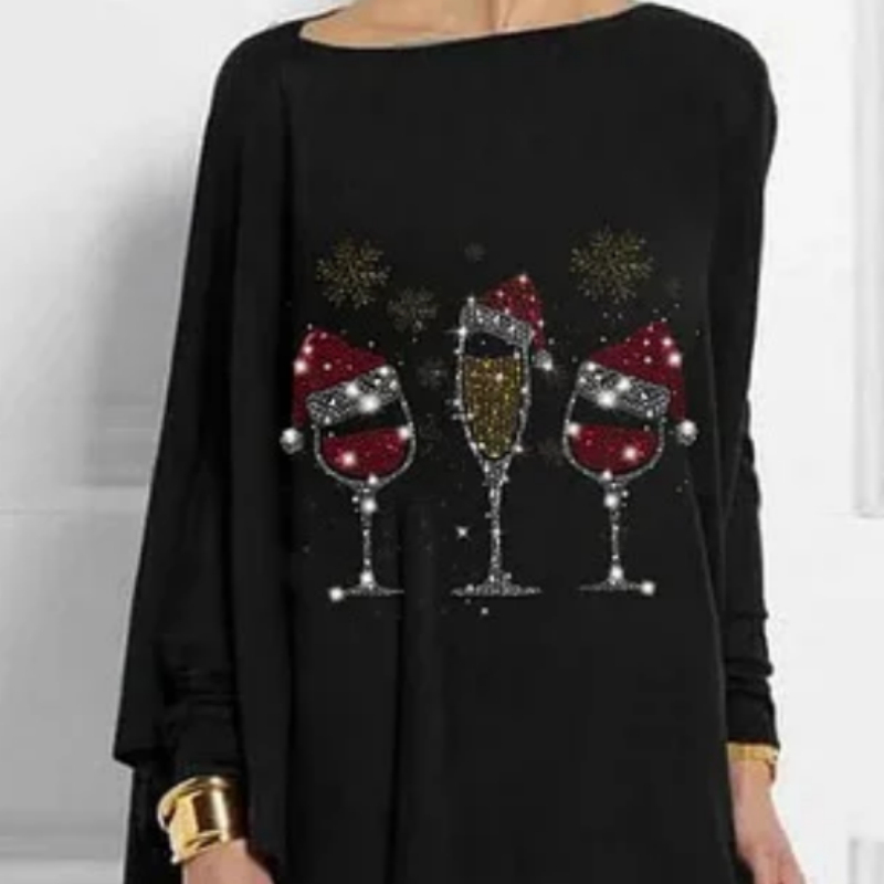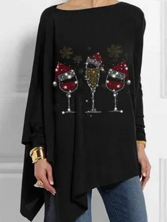 Christmas Wine Glass Print Mid-Length Irregular Tops