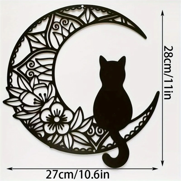 Introducing our charming Bohemian-style crescent cat wall decoration, a perfect blend of whimsical pet-themed art and modern home decor, ideal for adding a touch of personality to any room and serving as a delightful Christmas or holiday gift for cat enthusiasts.This decorative wall piece features an intricately designed crescent moon shape with a stylish cat silhouette, crafted from lightweight and durable aluminum with a subtle finish that complements various interior styles, from bohemian to contemporary, making it a versatile and eye-catching addition to your living space.Crescent moon cat wall decor, bohemian iron art, pet-themed metal wall hanging, floral pattern moon decor, whimsical home accentDimensions: 27cm (10.6in) × 28cm (11in)Material: Sturdy iron (metal)Style: Crescent moon + cat silhouette, bohemian floral pattern wall decor