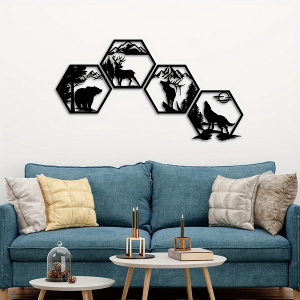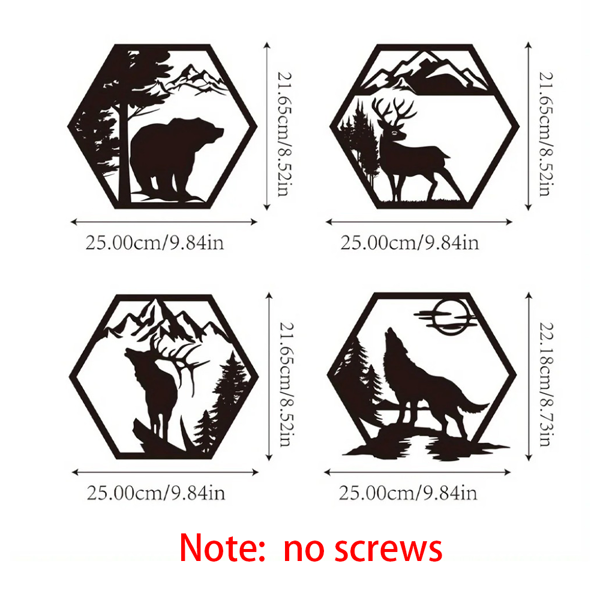 This exquisite set of hexagon aluminum wall art features charming forest animals, bringing a touch of natural elegance to your outdoor or indoor space.Crafted from lightweight and rust-resistant aluminum, this wall decor set showcases detailed animal silhouettes in a modern hexagonal design. It comes with pre-installed hanging hardware for easy setup and is weather-resistant, perfect for year-round display as a festive holiday gift or everyday home accent.Hexagon forest animal decor set, iron wildlife wall art, rustic outdoor metal hangings, bear/deer/wolf silhouette decor, nature-themed home accentsQuantity: 4-piece setDimensions per panel: 25.00cm (9.84in) × 21.65cm (8.52in) (3 panels); 25.00cm (9.84in) × 22.18cm (8.73in) (1 panel)Material: Sturdy iron (metal)Style: Hexagonal silhouette, forest wildlife (bear/deer/wolf) theme wall decor