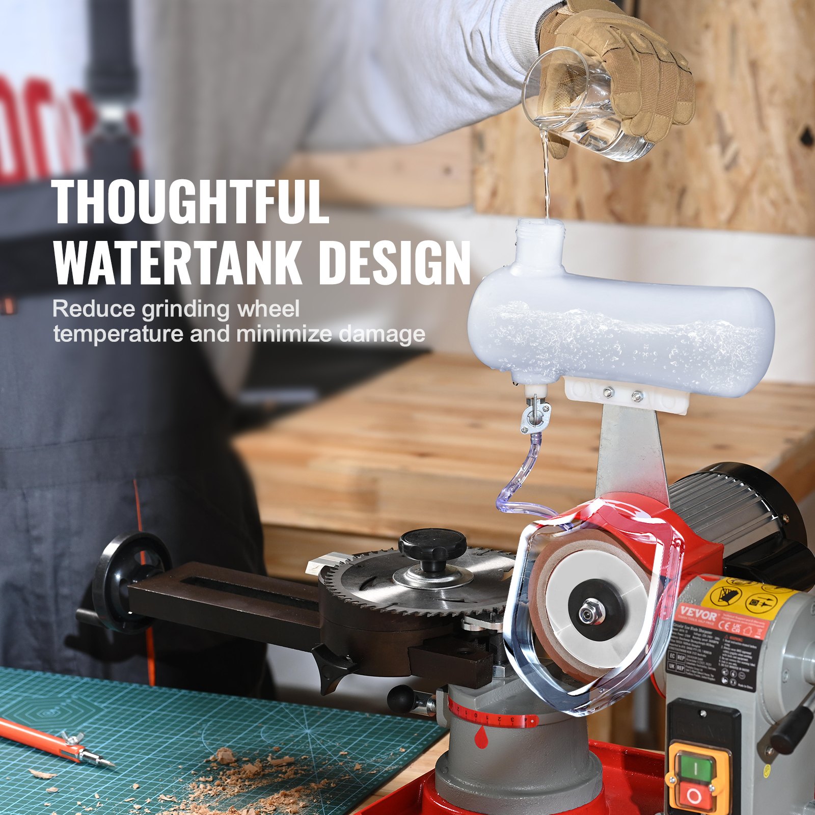 Sharper Blades, Smoother Cuts: Say goodbye to dull blades! VEVOR 370W powerful water injection circular saw blade sharpener, running at 3600RPM high speed, efficiently sharpens your saw blades to their former sharpness, leaving them razor-sharp, resilient, and burr-free.